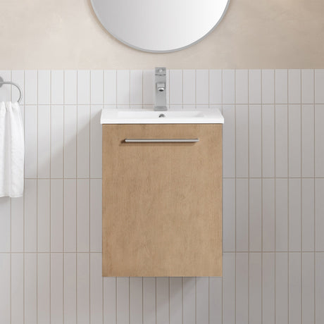 MILLS 18IN VANITY IN SAHARA BIRCH WITH A WHITE INTEGRATED CERAMIC BASIN