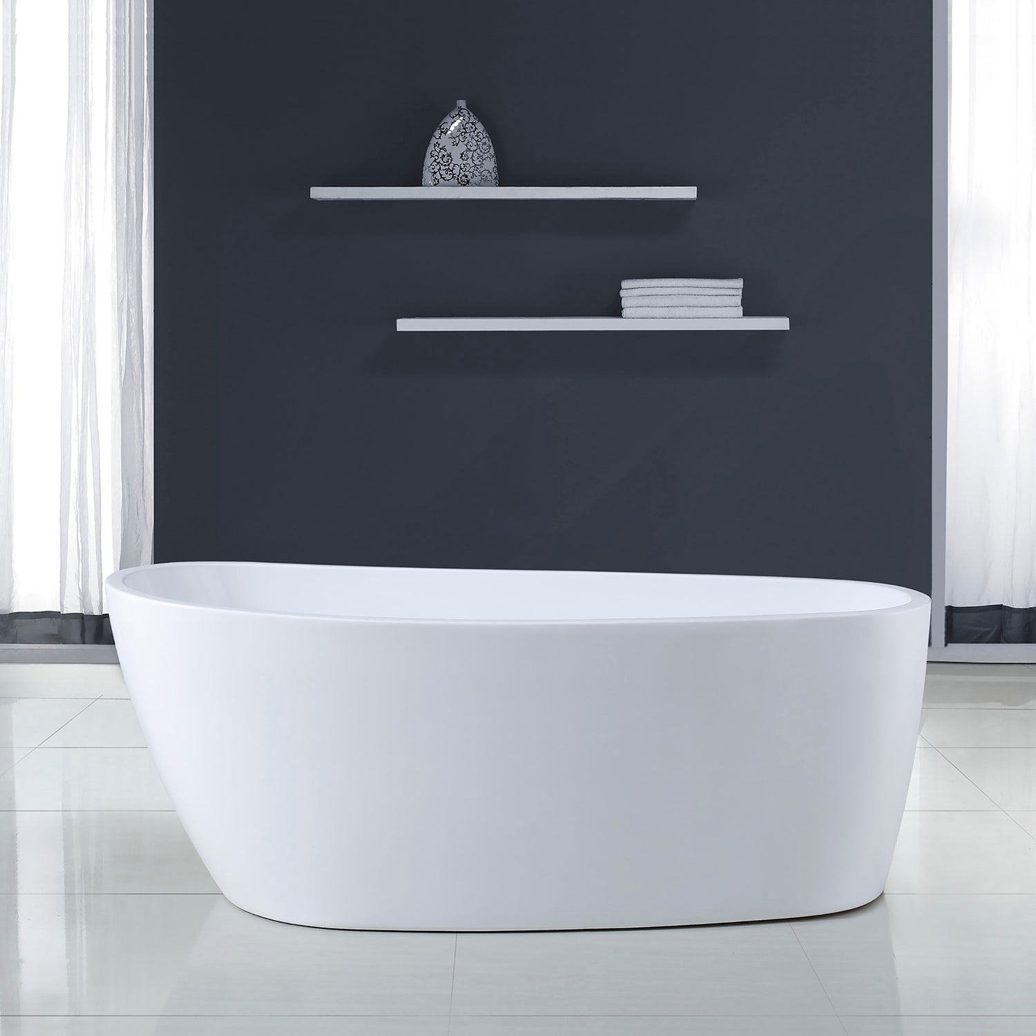 Soaking depth of 15-3/4 in. with a 76-5/7 gal. capacity. Concealed, adjustable leveling legs. Includes preinstalled chrome pop-up drain and waste overflow. not interchangeable. No faucet holes - supports wall-mounted or freestanding faucets. Faucet not included. Flexible P-trap available separately - model# CA401FLEX