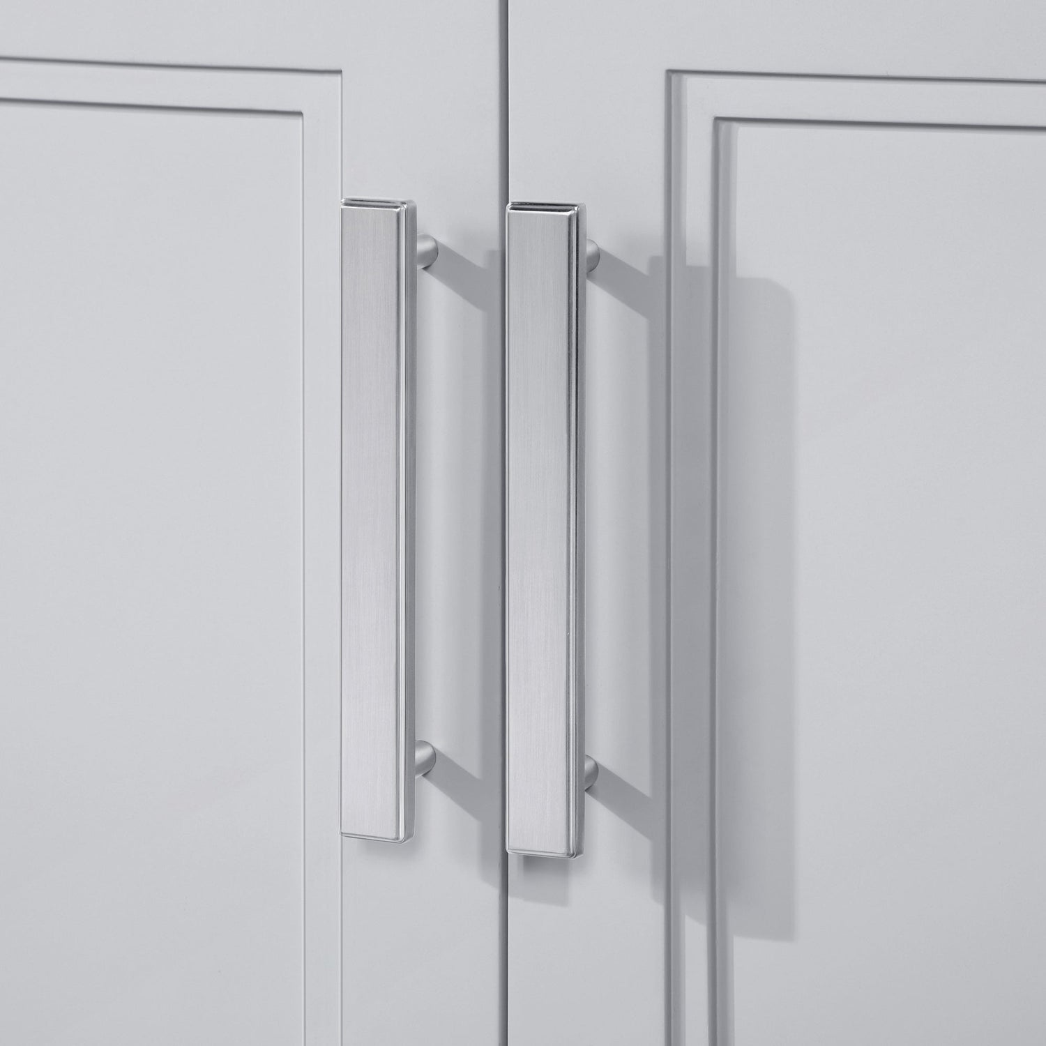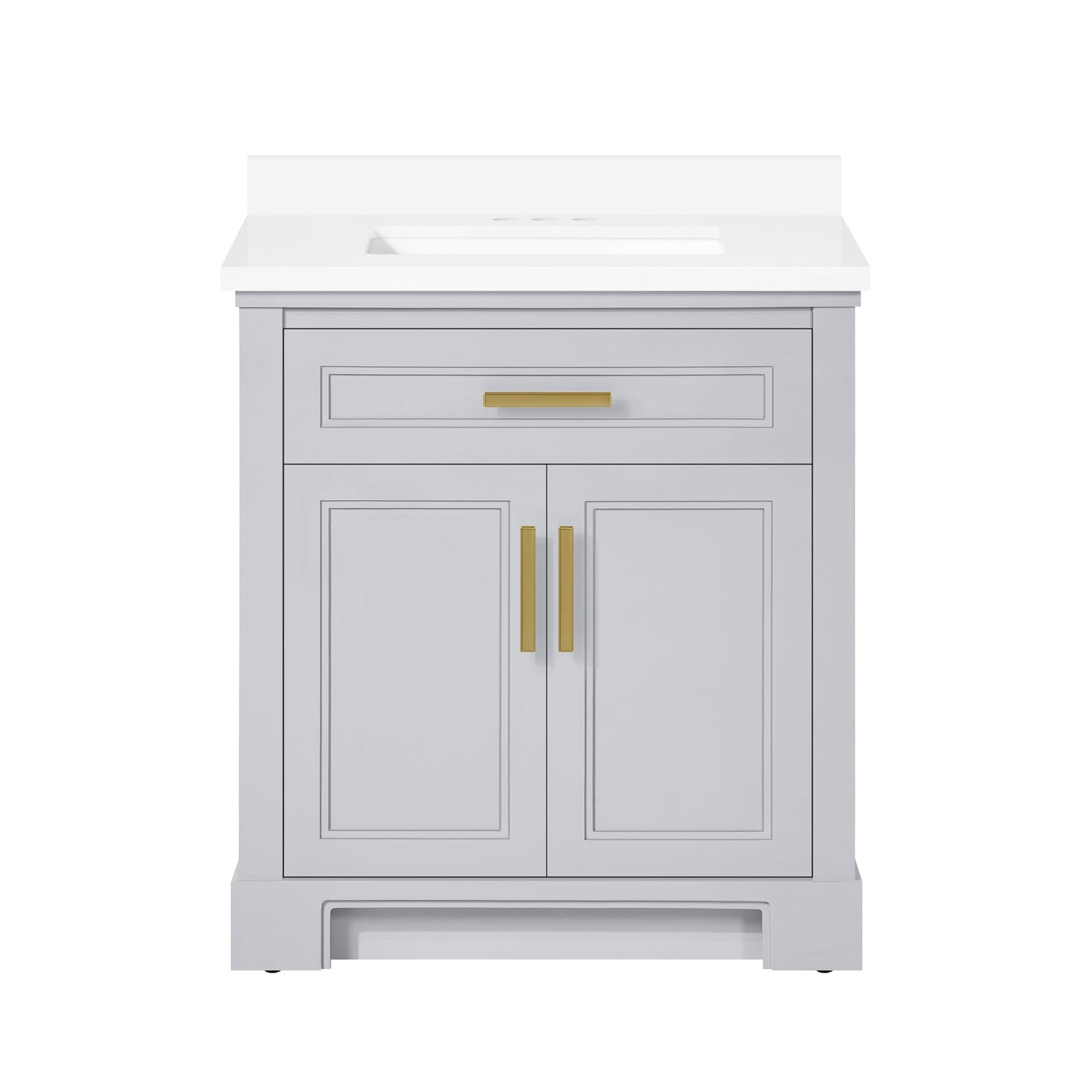 Cabinet features 2 soft-closing doors, 1 flip-down drawer, 1 adjustable shelf . Dove Grey cabinet with two sets of hardware in brushed nickel & champagne bronze. Integrated recessed toe kick for easy cleaning and concealing supply lines. White Quartz top with matching 3" backsplash & ceramic basin with pre-drilled holes for 4" faucet (faucet not included)