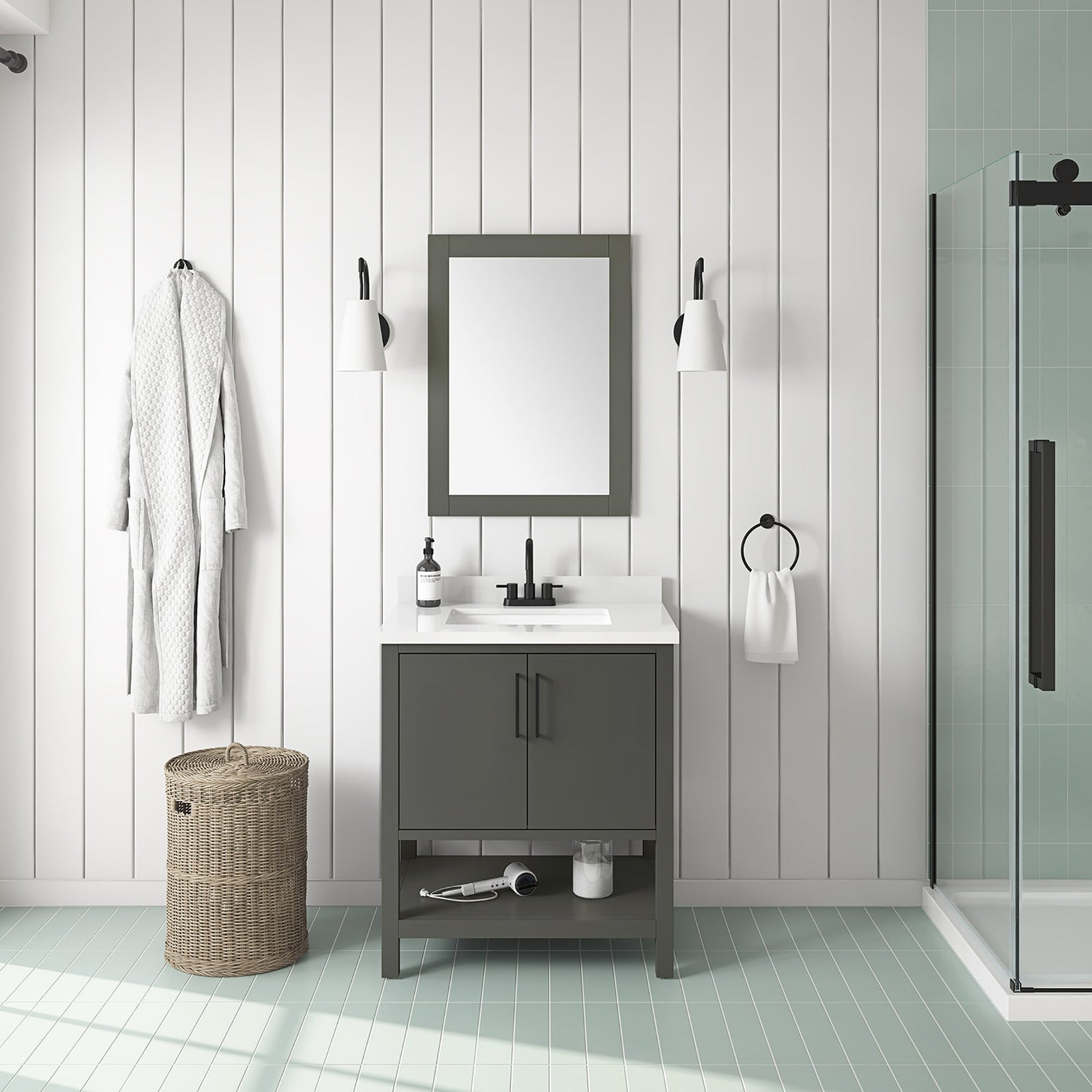 BANKS 30IN VANITY WITH SLAB DOOR IN CHARCOAL GREY WITH WHITE QUARTZ TOP & CERAMIC BASIN is backordered and will ship as soon as it is back in stock.