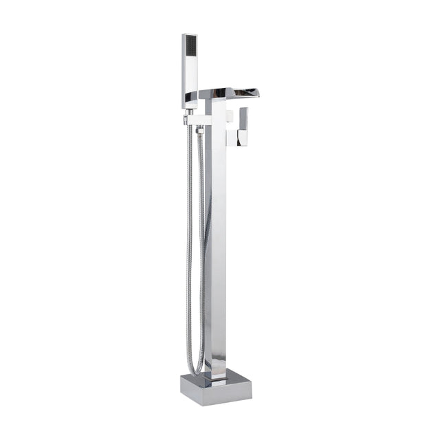 Constructed of solid brass with polished chrome finish. Freestanding floor mount tub faucet with drip-free ceramic disc valve. Lever handle diverter switches between faucet and handshower. Includes handshower with 5 ft. hose and mounting hardware. Residential Use Only