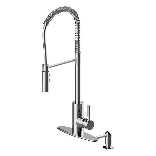 Constructed of solid brass with a polished chrome finish. Pull-down spray head features two spray modes: aerated and full. Includes soap dispenser and mounting hardware. Drip-free ceramic disc cartridge. Optional deck plate included