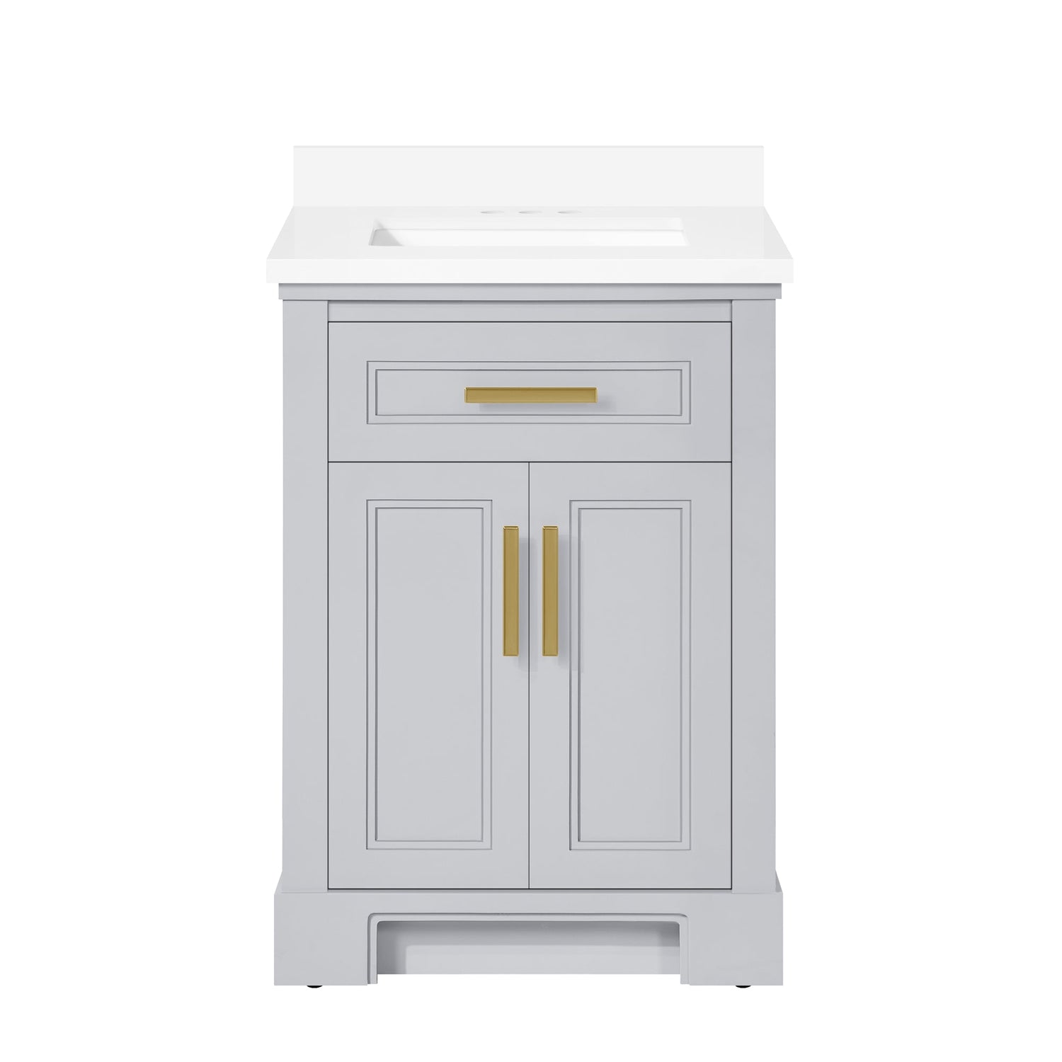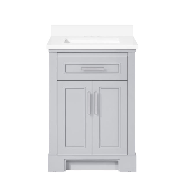 Cabinet features 2 soft-closing doors, 1 flip-down drawer, 1 adjustable shelf. Dove Grey cabinet with two sets of hardware in brushed nickel & champagne bronze. Integrated recessed toe kick for easy cleaning and concealing supply lines. White Quartz top with matching 3" backsplash & ceramic basin with pre-drilled holes for 4" faucet (faucet not included)
