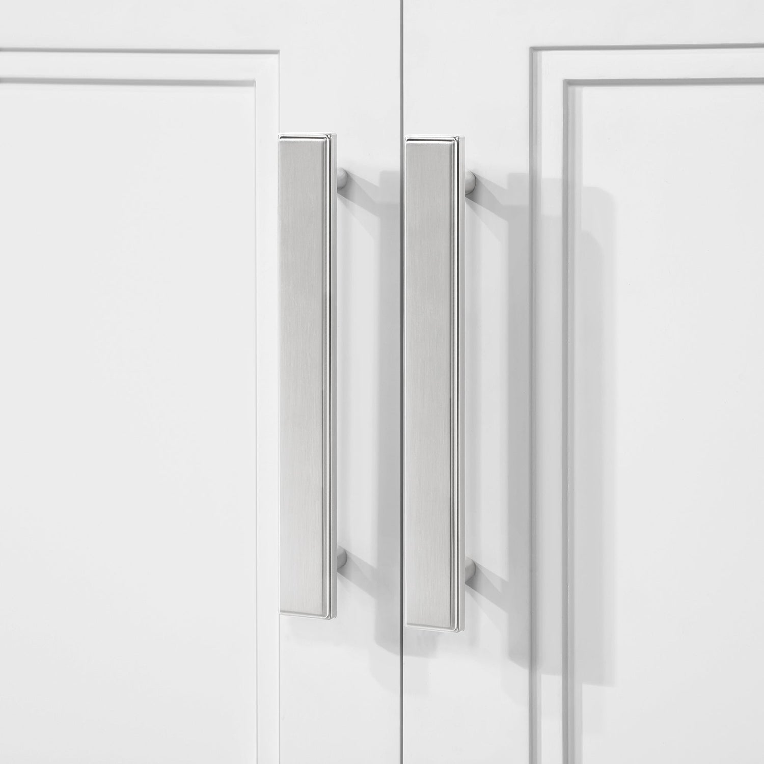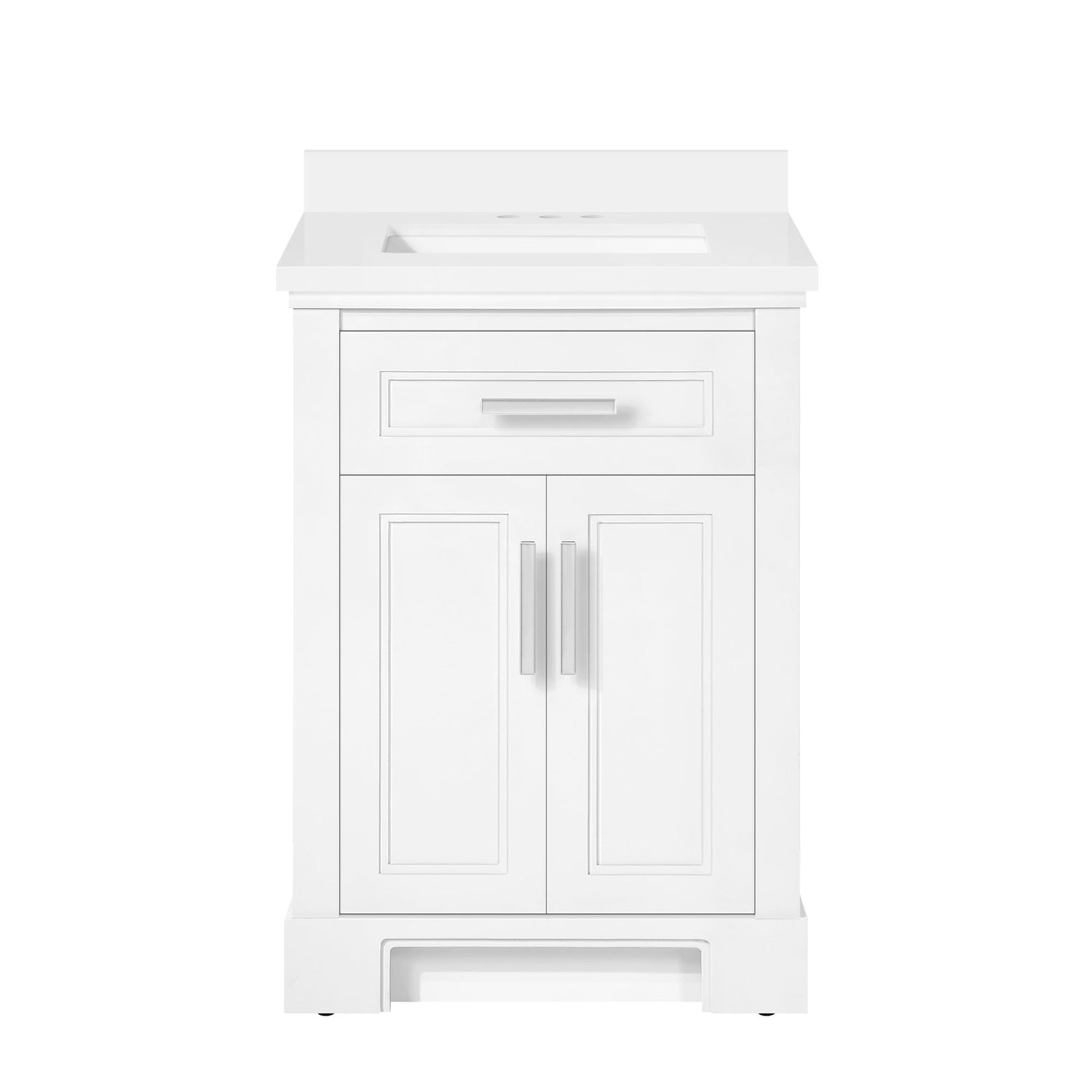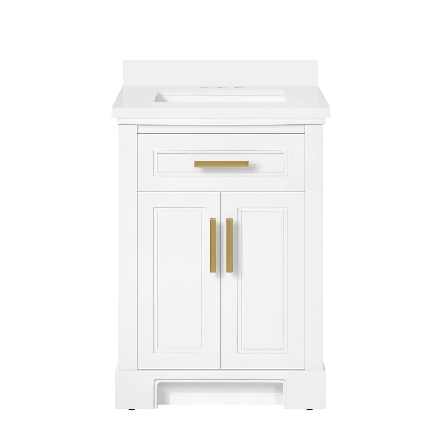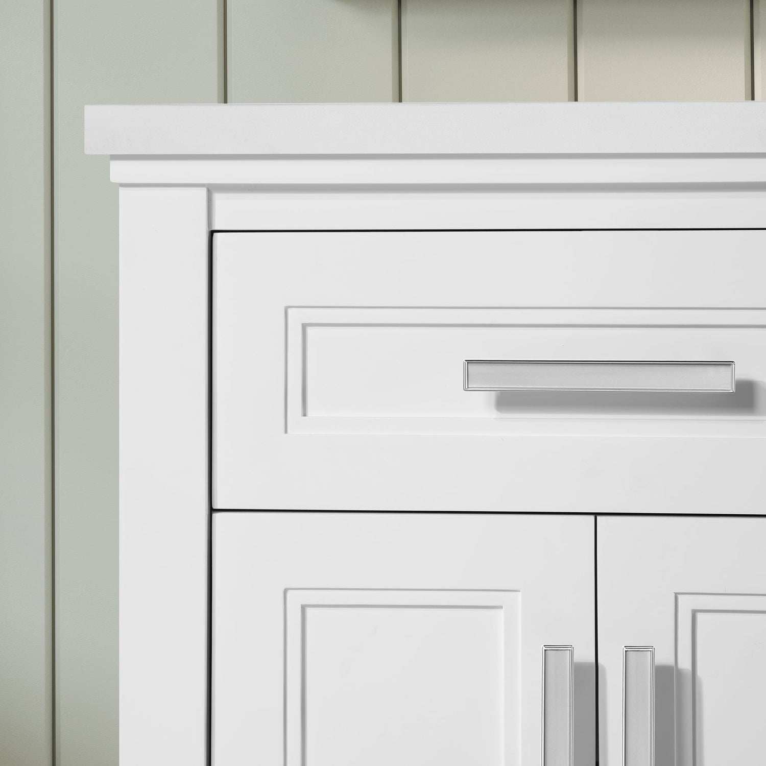 Cabinet features 2 soft-closing doors, 1 flip-down drawer, 1 adjustable shelf . Integrated recessed toe kick for easy cleaning and concealing supply lines. White cabinet with two sets of hardware in brushed nickel & champagne bronze. White Quartz top with matching 3" backsplash & ceramic basin with pre-drilled holes for 4" faucet (faucet not included)