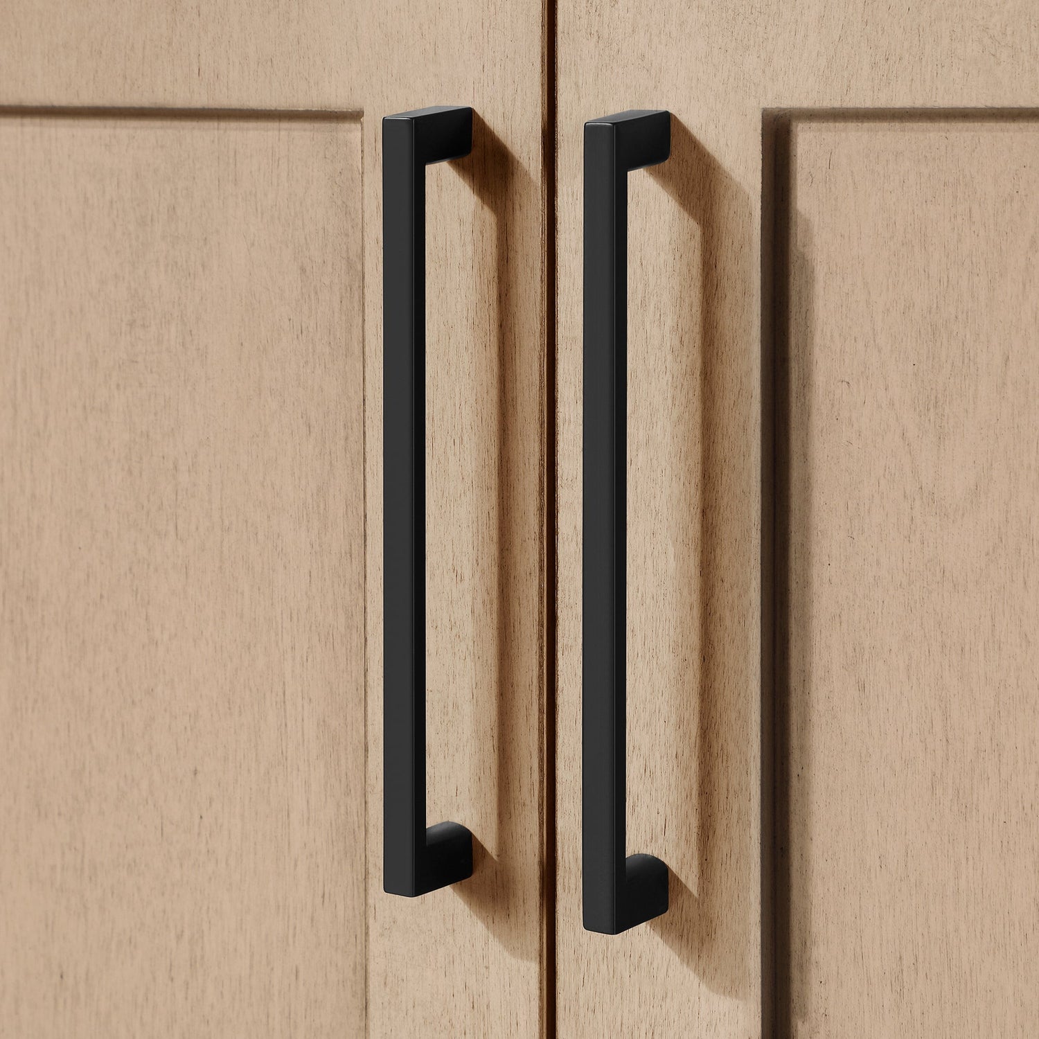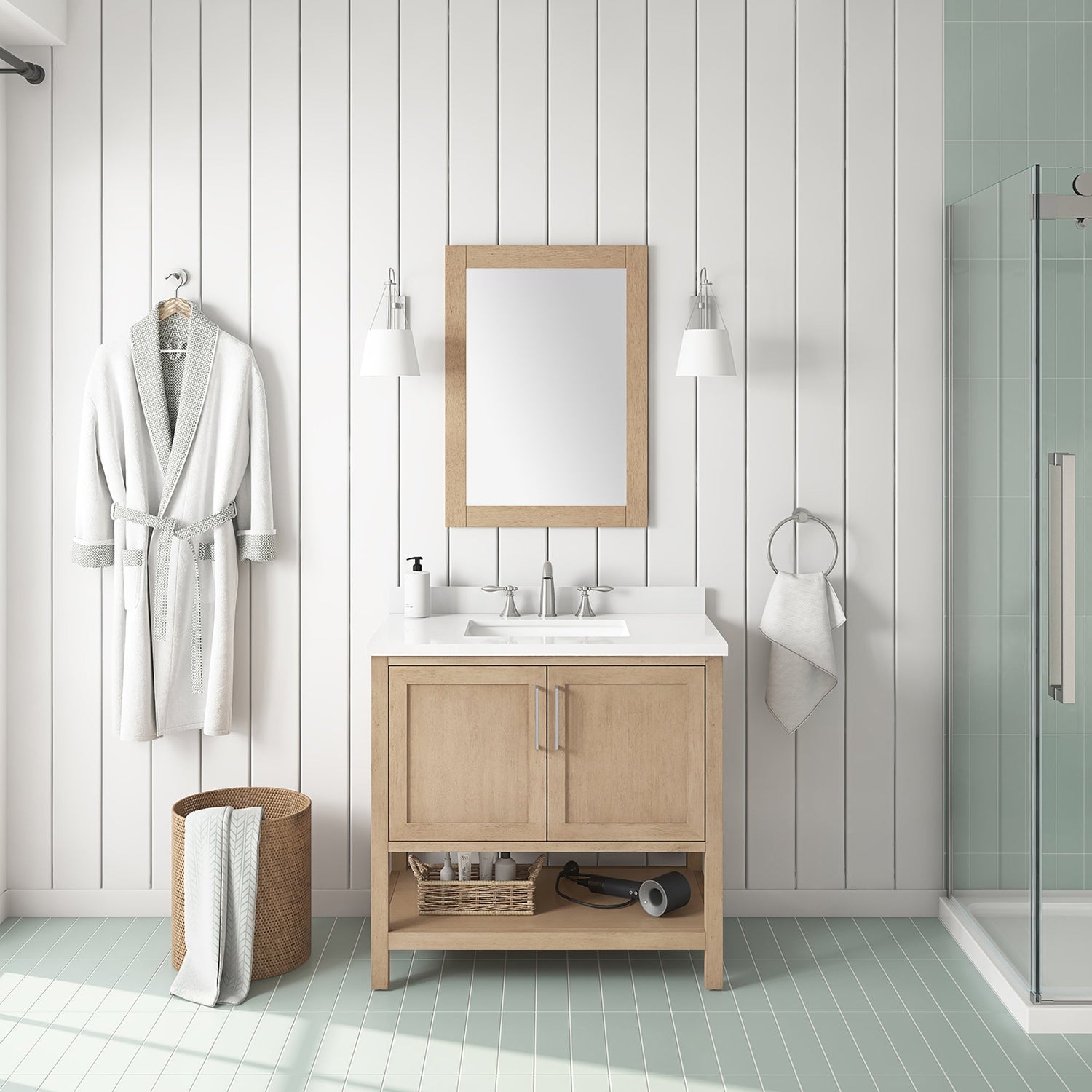 Cabinet features 2 soft-closing doors, 1 adjustable shelf& 1 open shelf. Cabinet has shaker style doors. Sahara Birch cabinet with with two sets of hardware in brushed nickel & matte black. White Quartz top with matching 3" backsplash & ceramic basin with pre-drilled holes for 8" faucet (faucet not included)