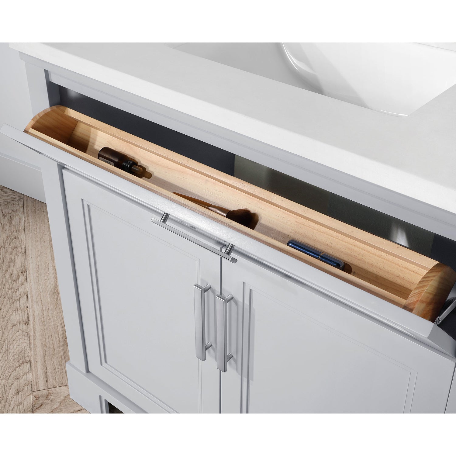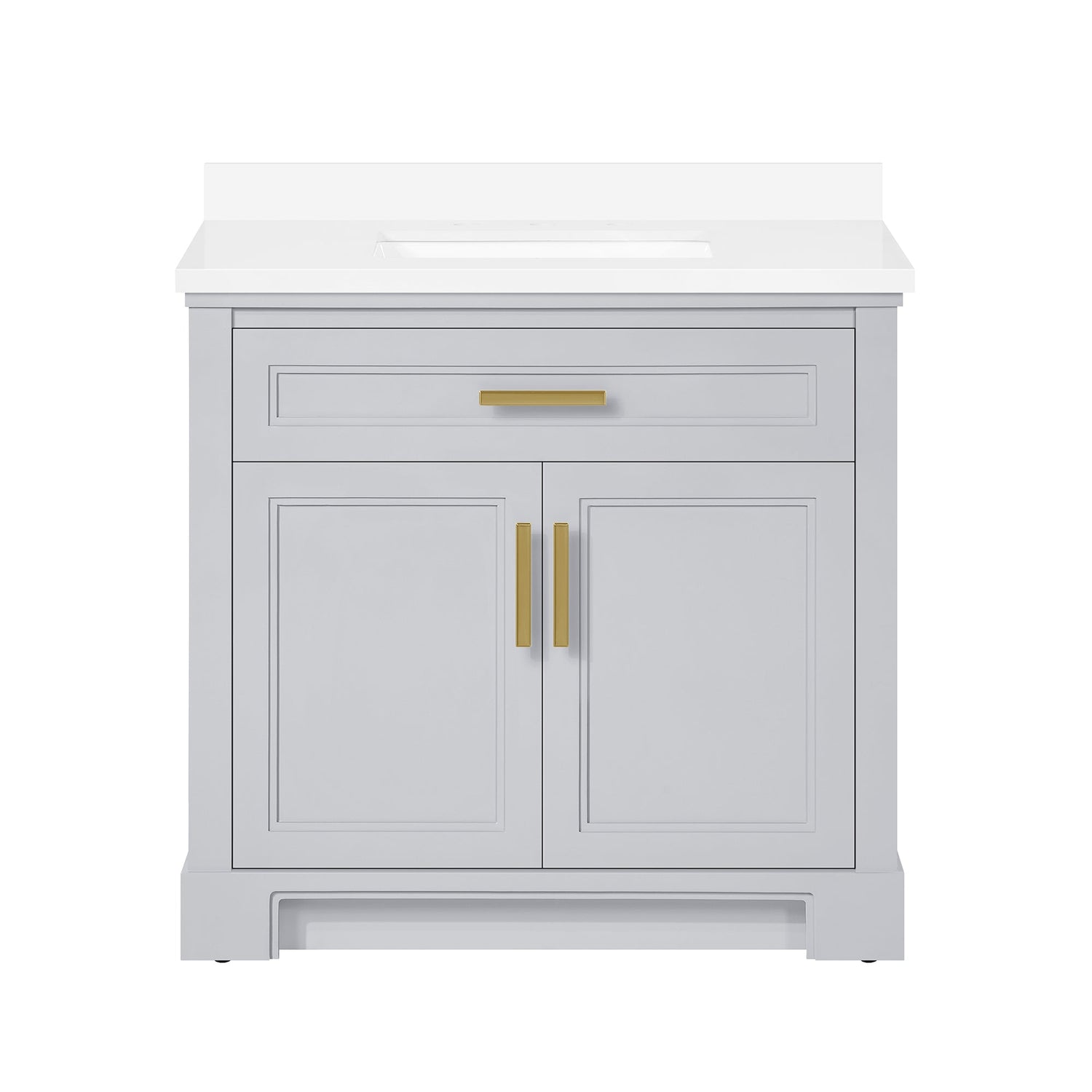 Cabinet features 2 soft-closing doors, 1 flip-down drawer, 1 adjustable shelf. Dove Grey cabinet with two sets of hardware in brushed nickel & champagne bronze. Integrated recessed toe kick for easy cleaning and concealing supply lines. White Quartz top with matching 3" backsplash & ceramic basin with pre-drilled holes for 4" faucet (faucet not included)