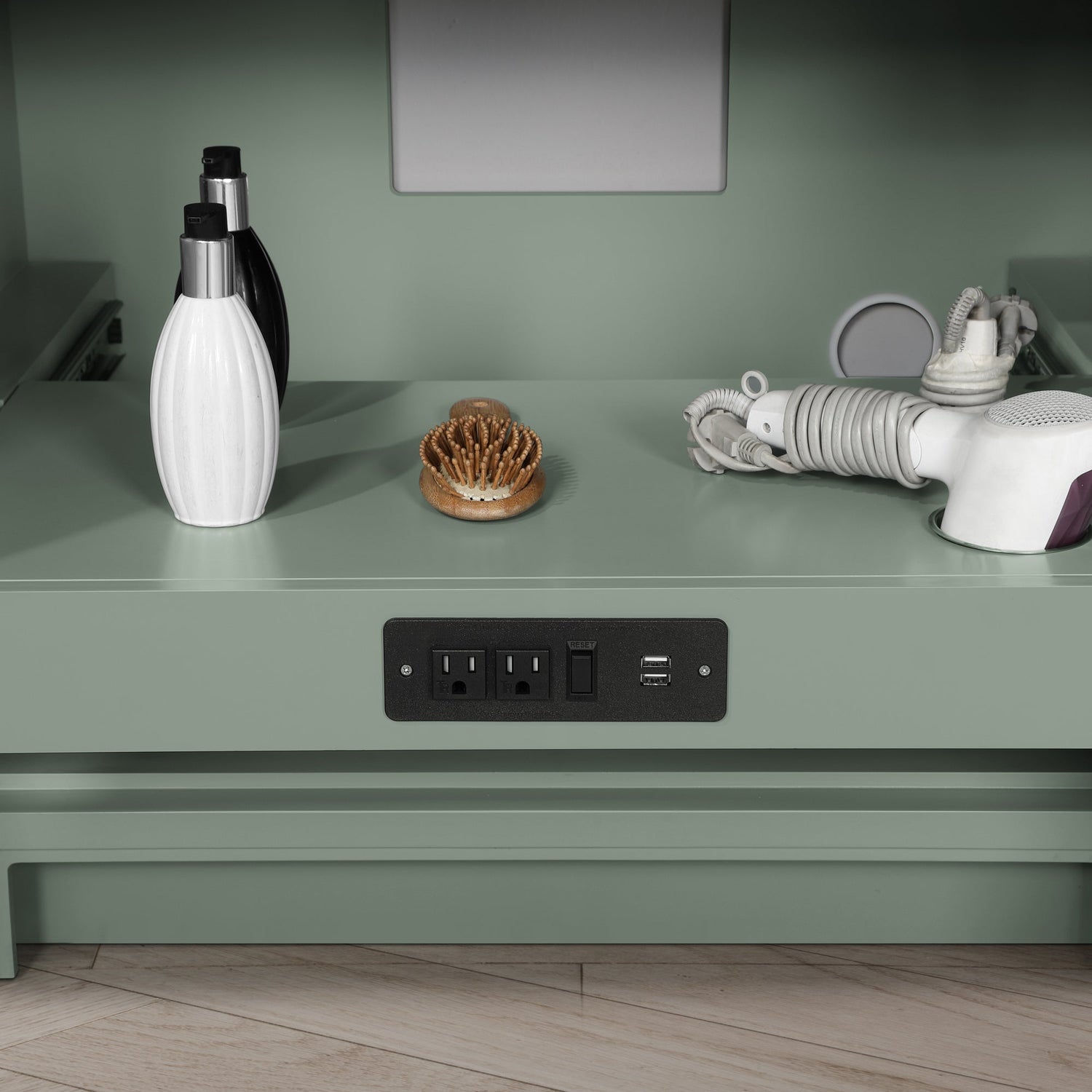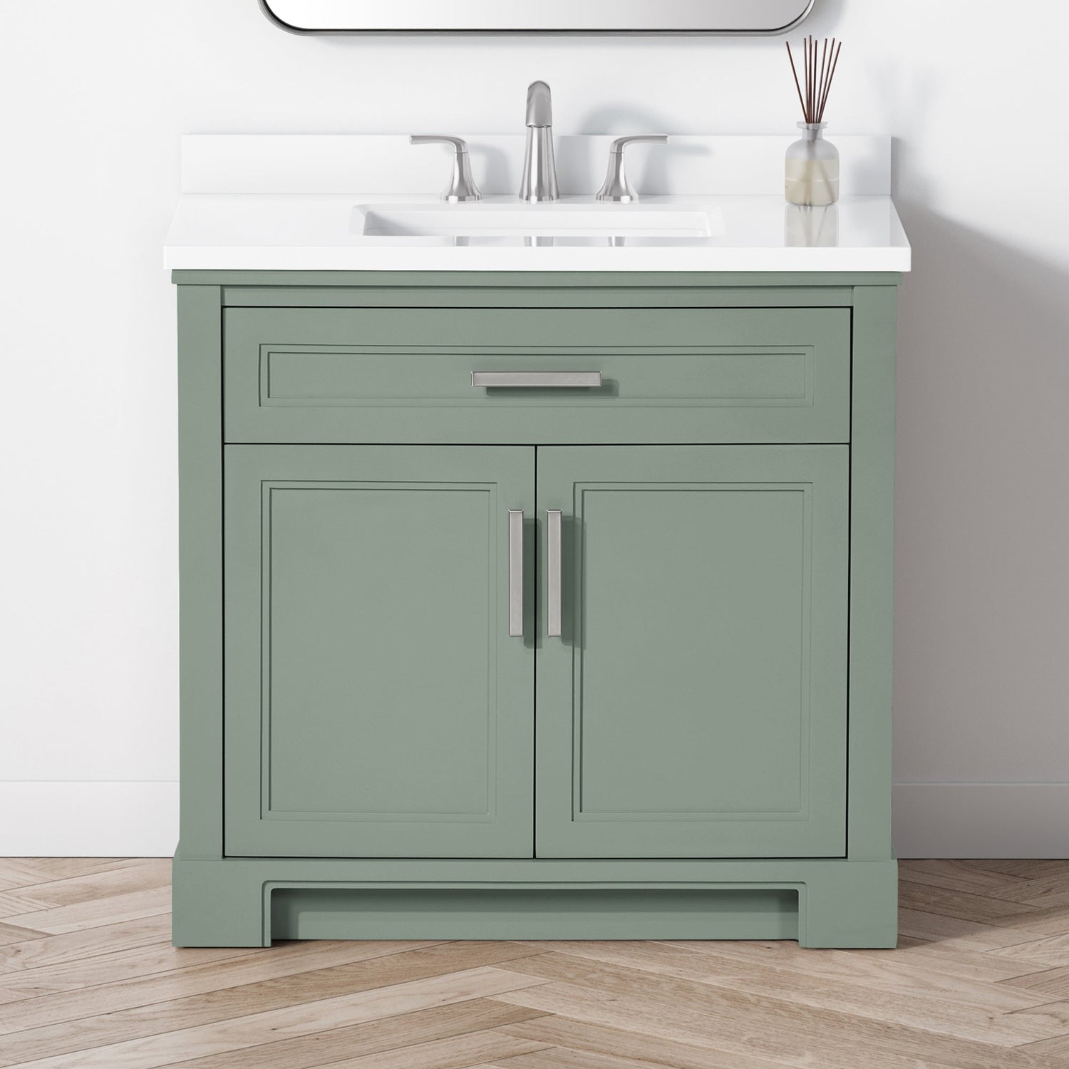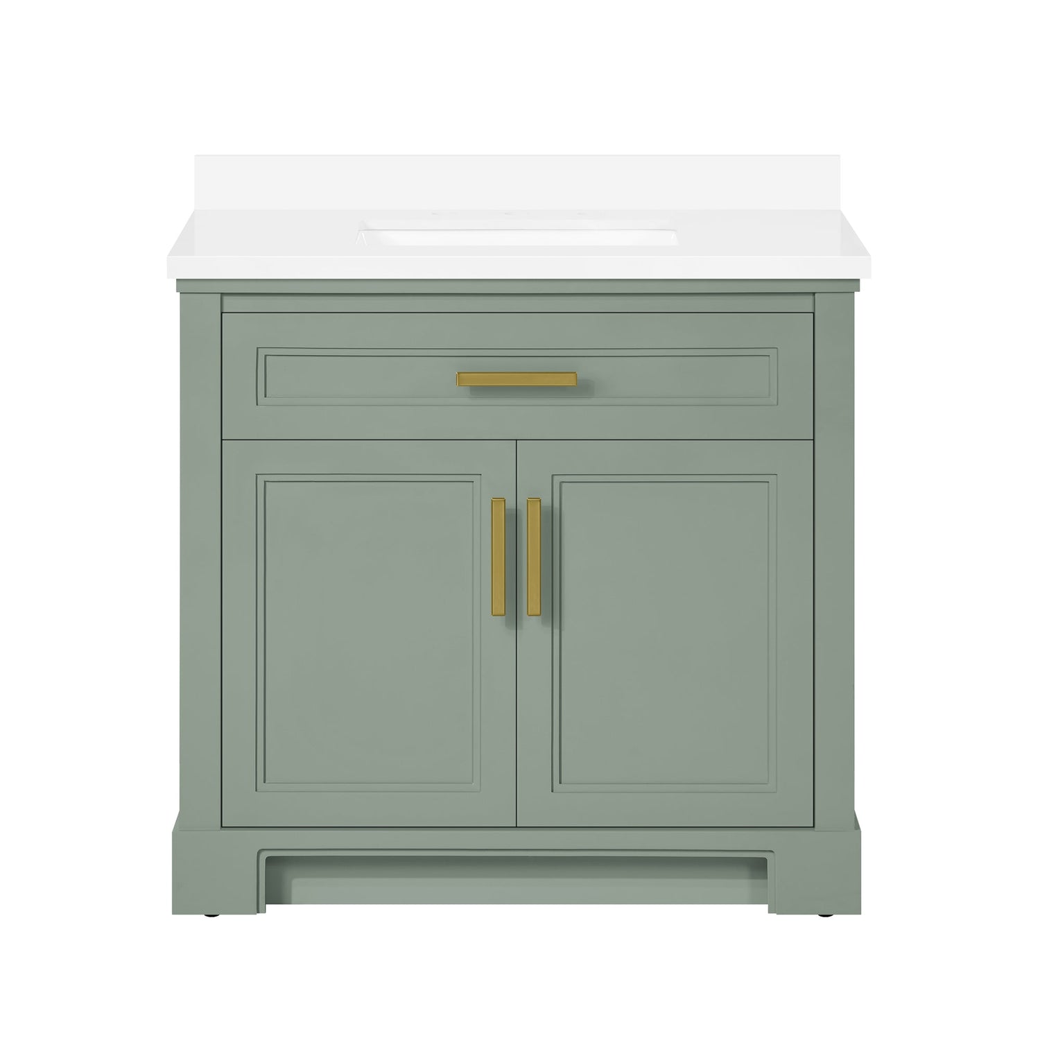 Cabinet features 2 soft-closing doors, 1 flip-down drawer, 1 adjustable shelf. Integrated recessed toe kick for easy cleaning and concealing supply lines. Sage Green cabinet with two sets of hardware in brushed nickel & champagne bronze. White Quartz top with matching 3" backsplash & ceramic basin with pre-drilled holes for 4" faucet (faucet not included)