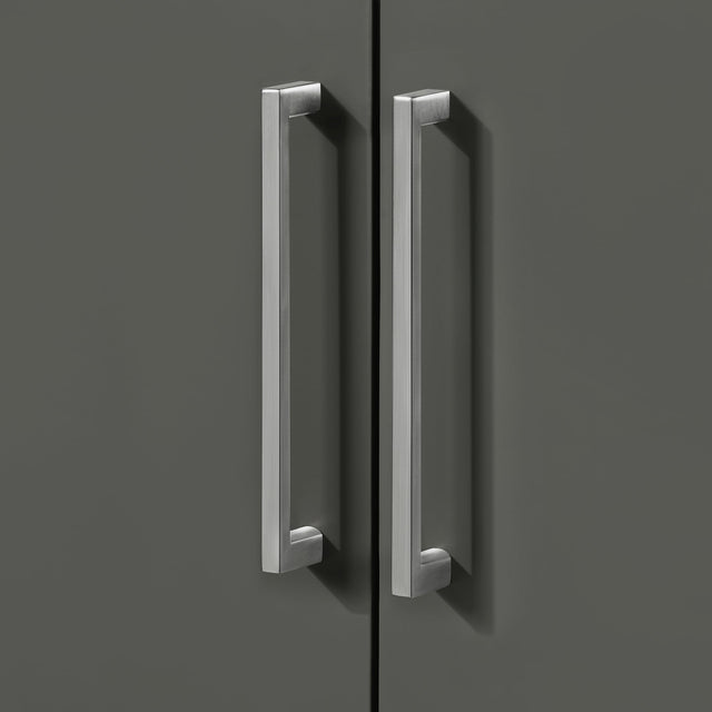 Cabinet features 2 soft-closing doors, 1 adjustable shelf& 1 open shelf. Cabinet has slab style doors. Charcoal Grey cabinet with with two sets of hardware in brushed nickel & matte black. White Quartz top with matching 3" backsplash & ceramic basin with pre-drilled holes for 8" faucet (faucet not included)