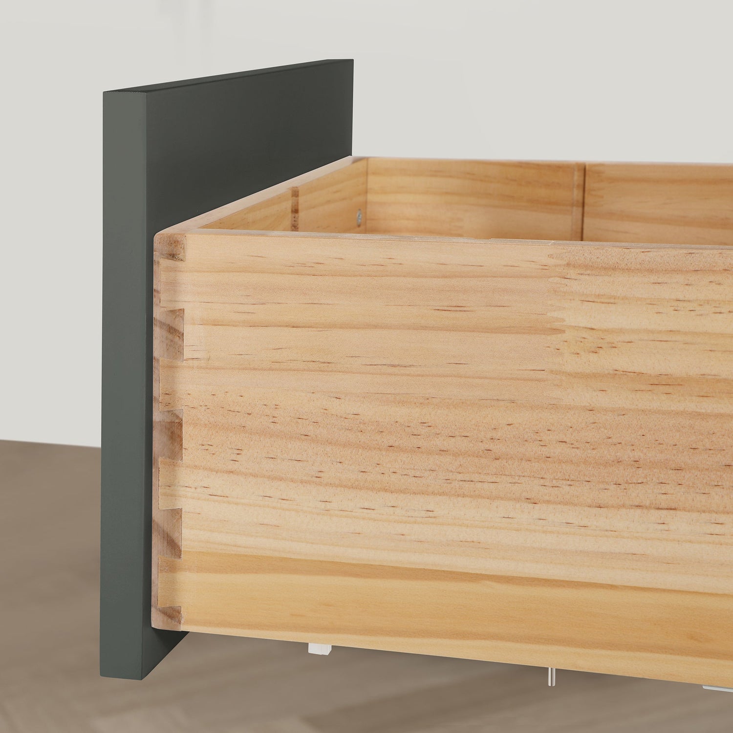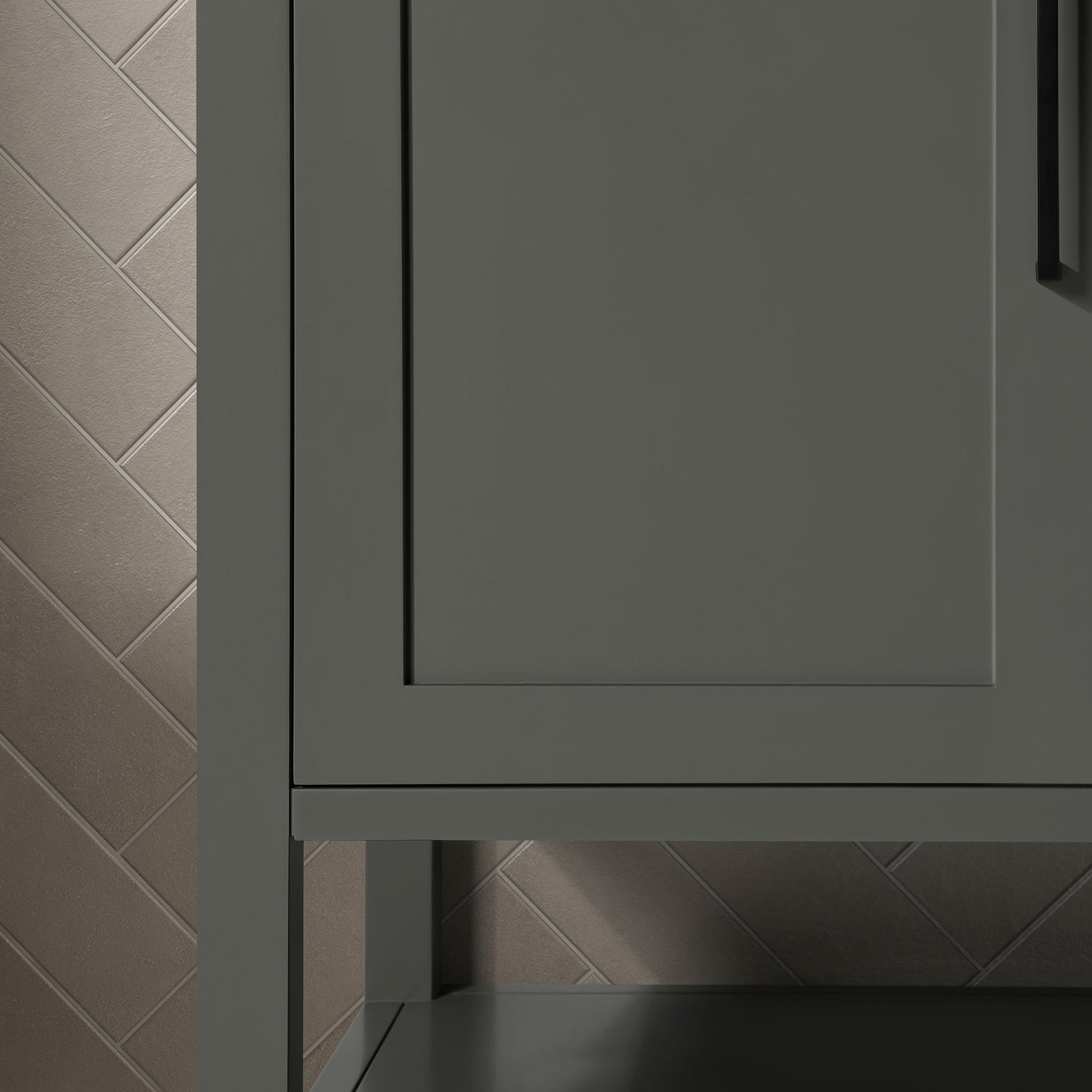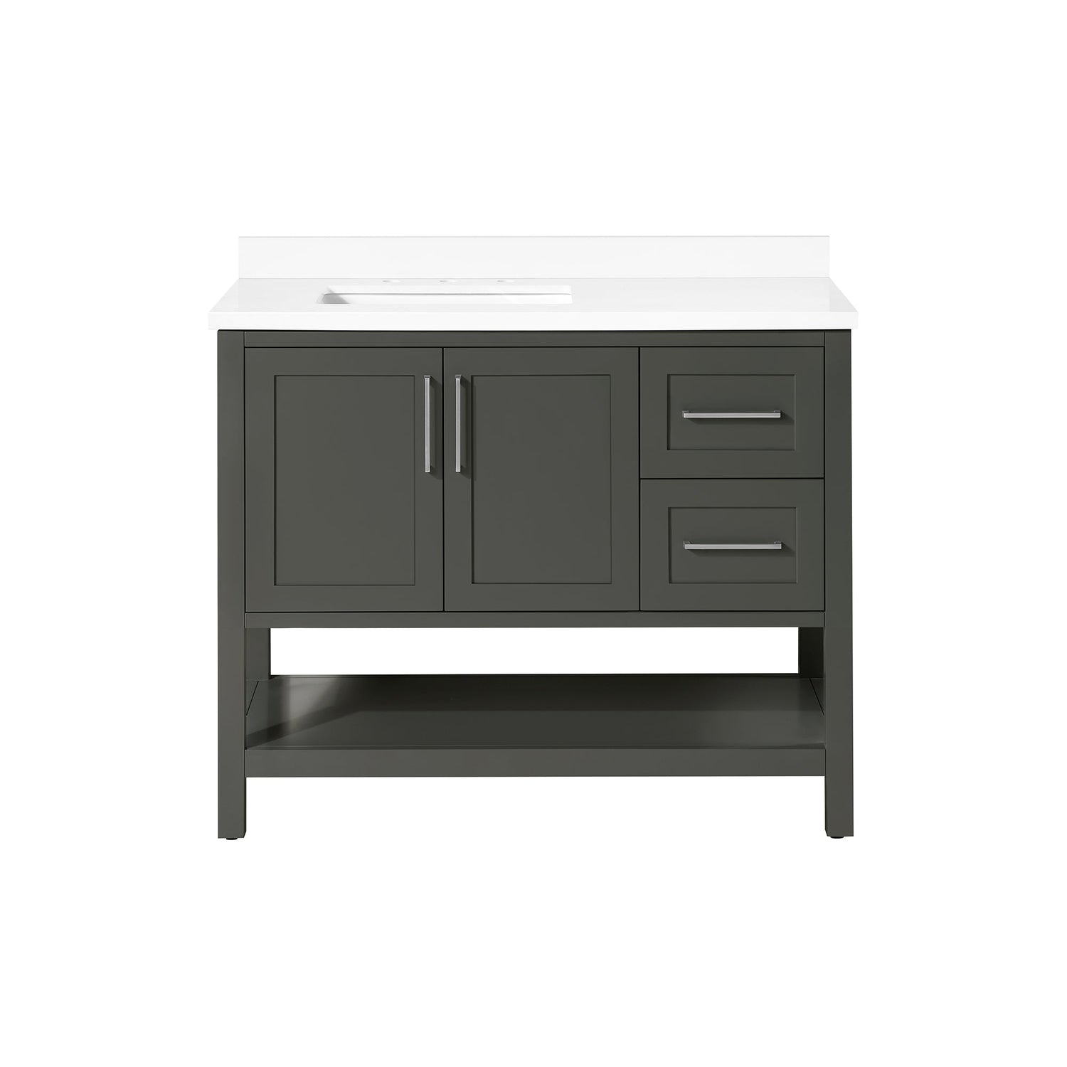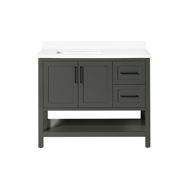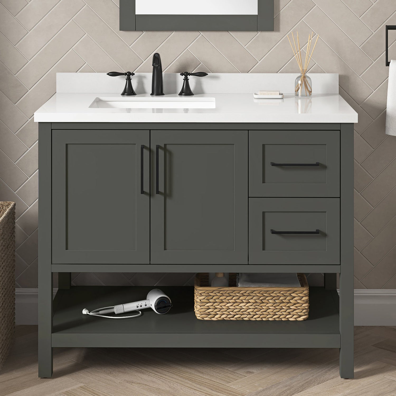 Cabinet features 2 soft-closing doors, 1 adjustable shelf& 1 open shelf. Cabinet has shaker style doors and drawers . Charcoal Grey cabinet with with two sets of hardware in brushed nickel & matte black. White Quartz top with matching 3" backsplash & ceramic basin with pre-drilled holes for 8" faucet (faucet not included)