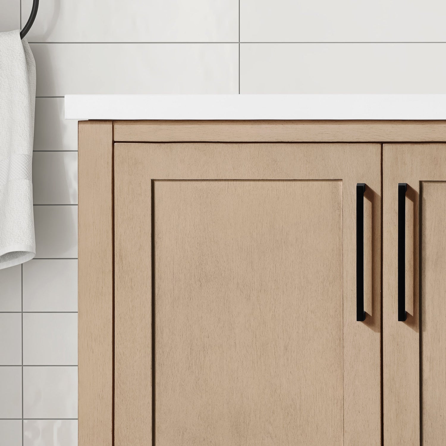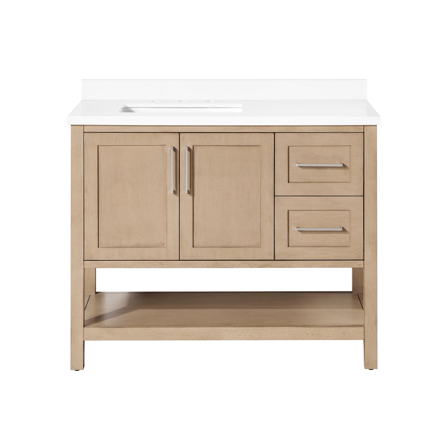 Cabinet features 2 soft-closing doors, 1 adjustable shelf& 1 open shelf. Cabinet has shaker style doors and drawers . Sahara Birch cabinet with with two sets of hardware in brushed nickel & matte black. White Quartz top with matching 3" backsplash & ceramic basin with pre-drilled holes for 8" faucet (faucet not included)