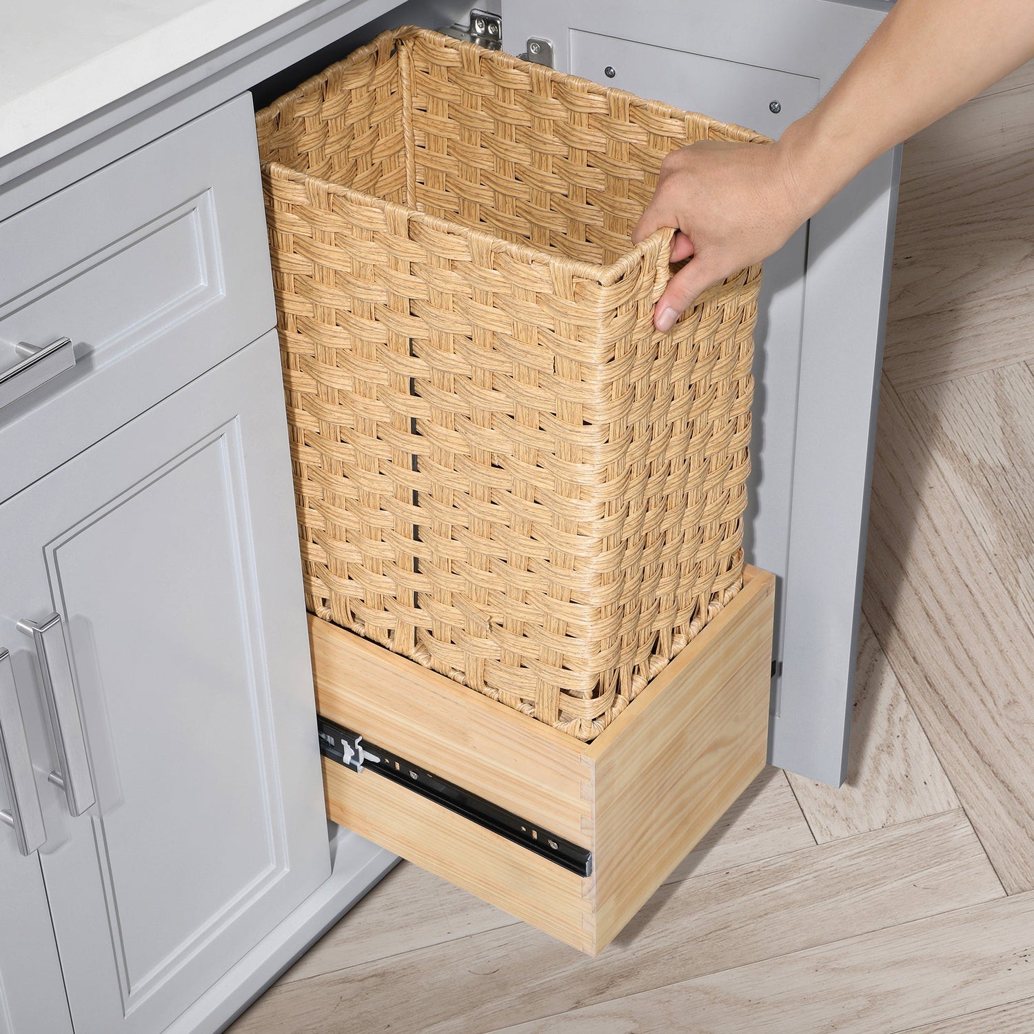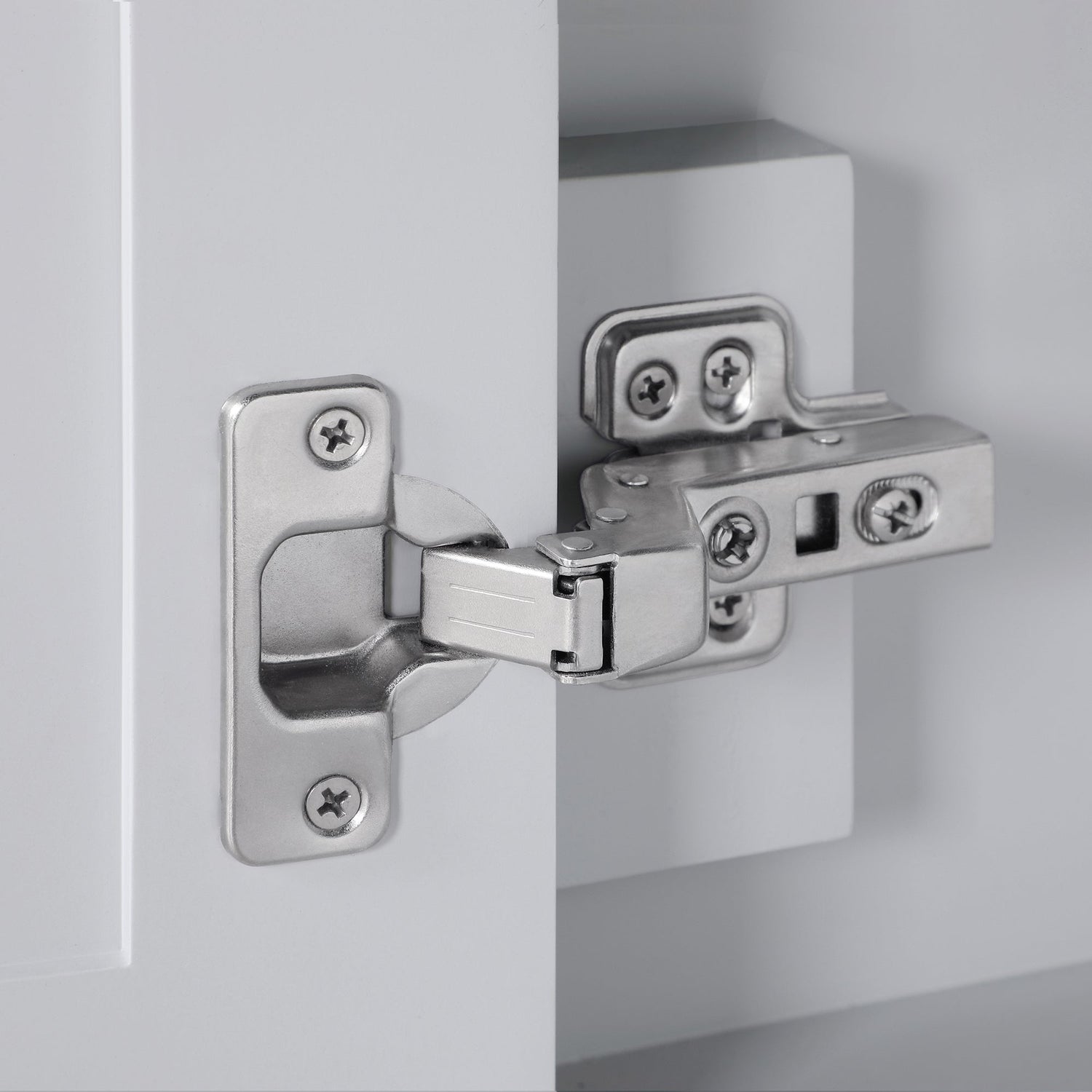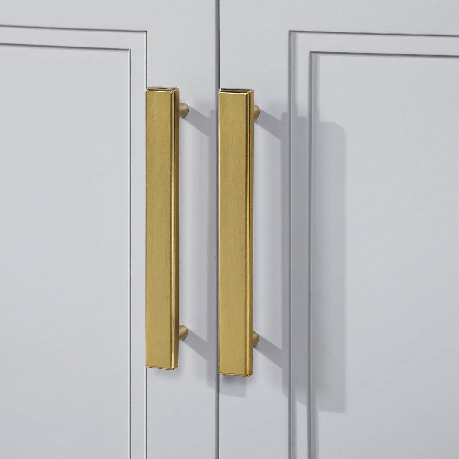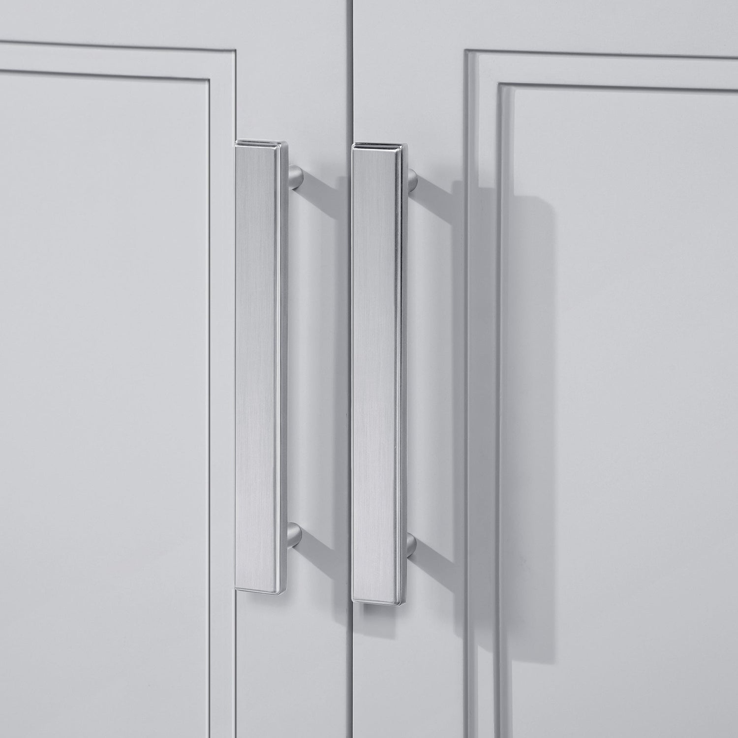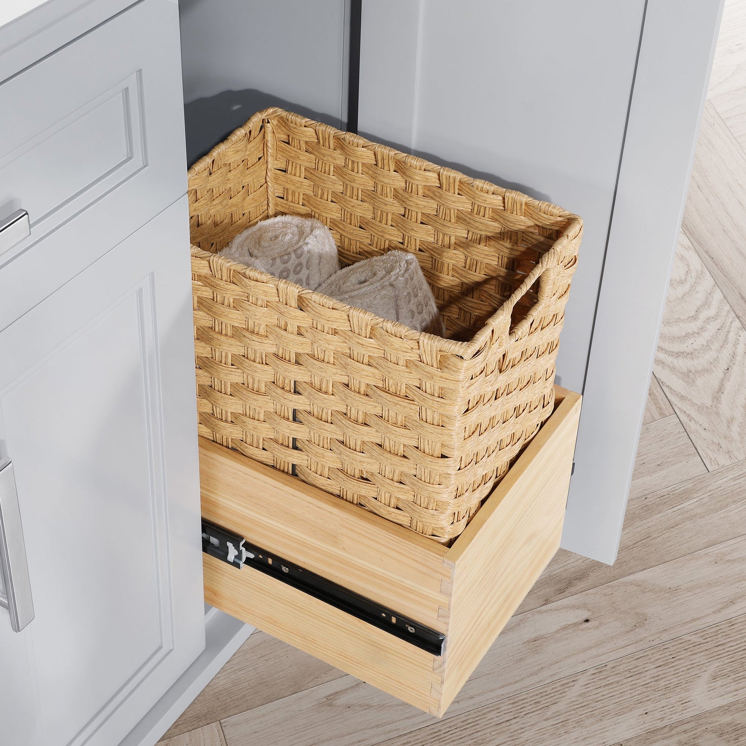 Cabinet features 3 soft-closing doors, 1 flip-down drawer, 1 adjustable shelf. Dove Grey cabinet with two sets of hardware in brushed nickel & champagne bronze. Includes slide out shelf with power bar, styling tool holders and pull out drawer with wicker hamper. Integrated recessed toe kick for easy cleaning and concealing supply lines. White Quartz top with matching 3" backsplash & ceramic basin with pre-drilled holes for 8" faucet (faucet not included)
