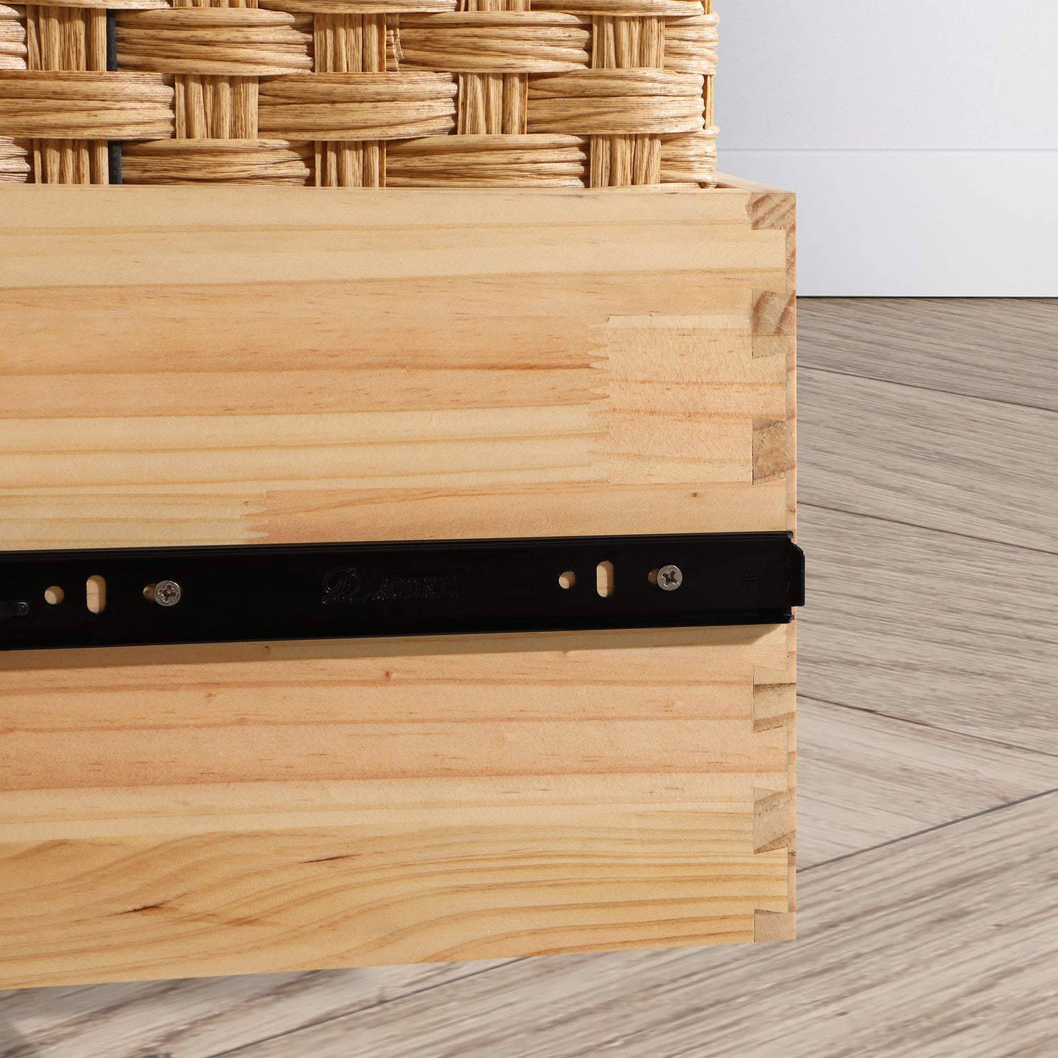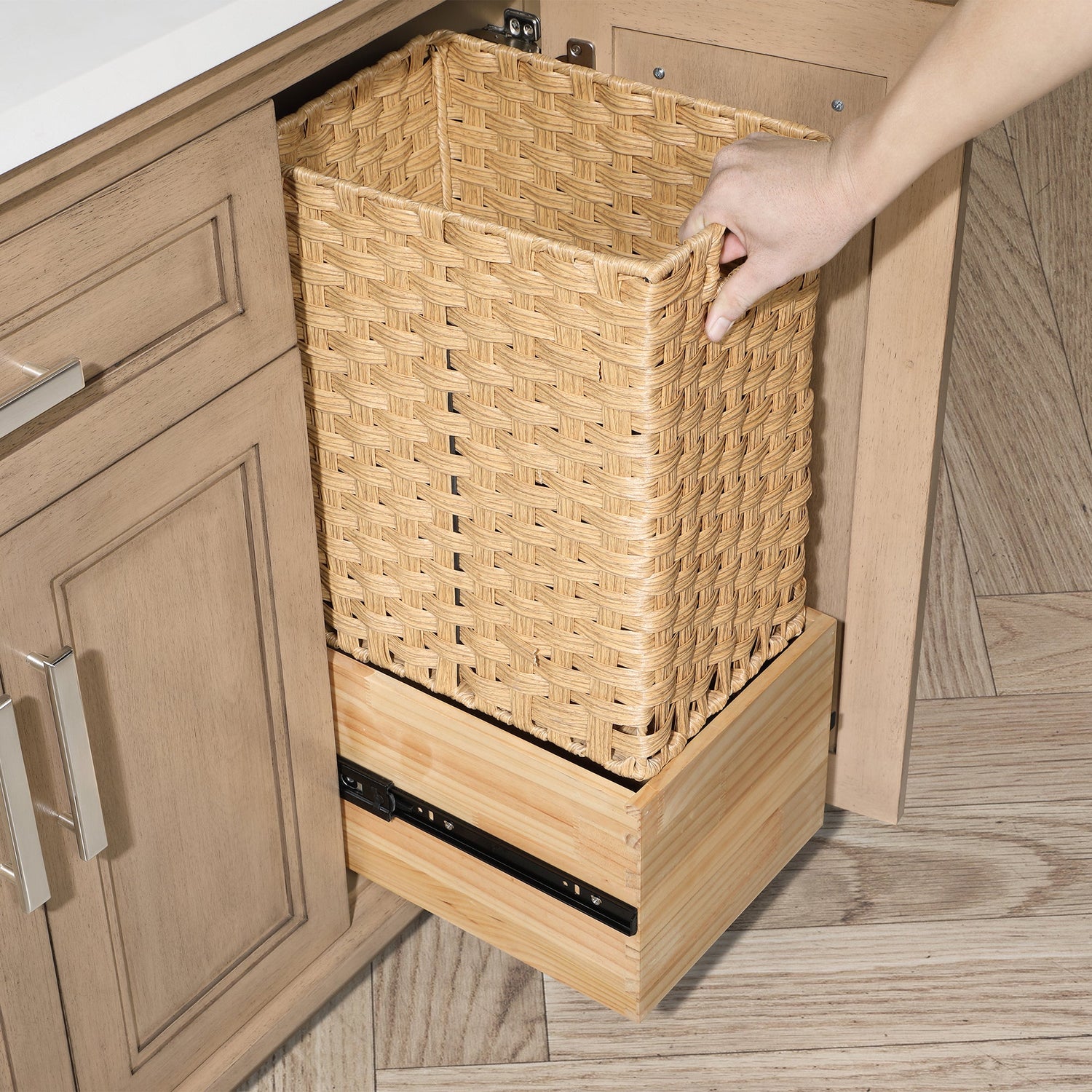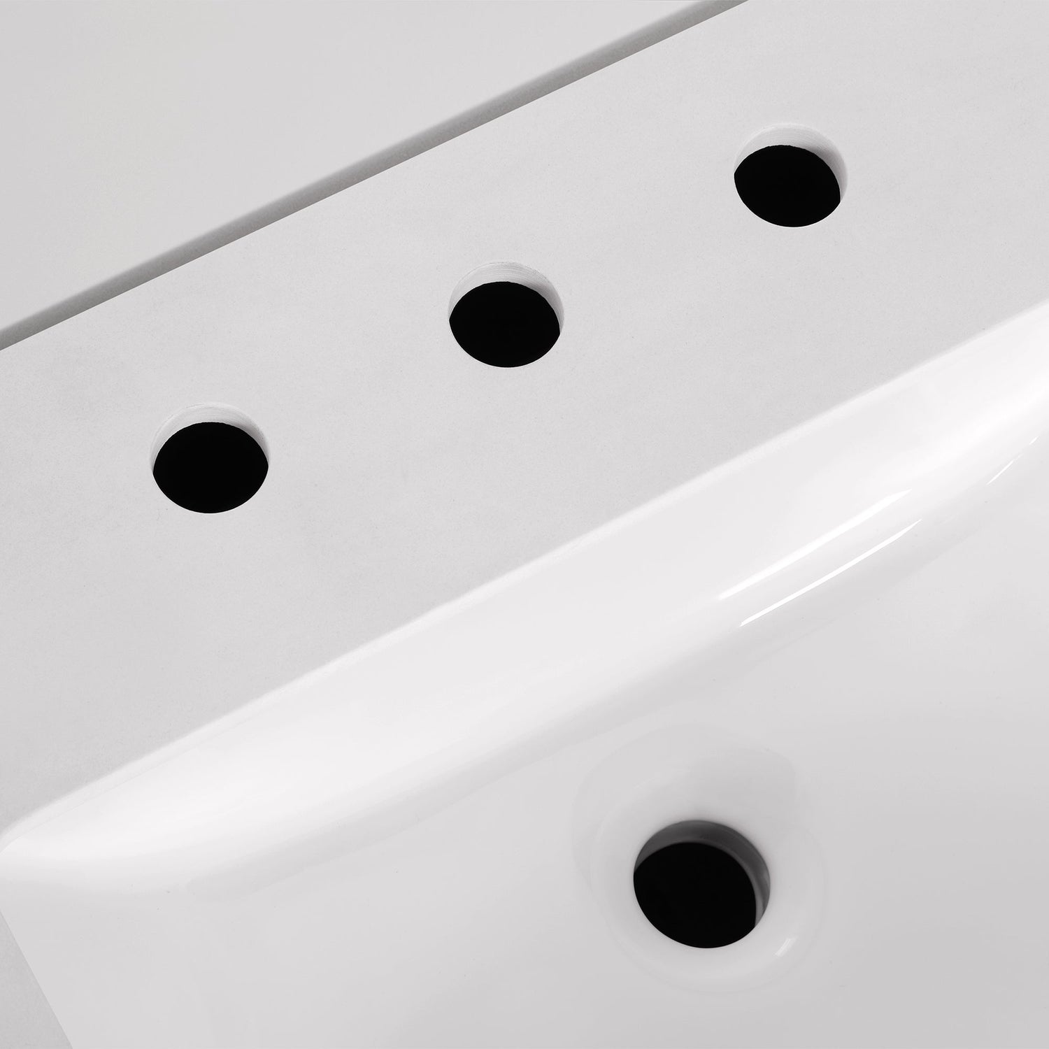 Cabinet features 3 soft-closing doors, 1 flip-down drawer, 1 adjustable shelf . Includes slide out shelf with power bar, styling tool holders and pull out drawer with wicker hamper. Integrated recessed toe kick for easy cleaning and concealing supply lines. Sahara Birch cabinet with two sets of hardware in brushed nickel & champagne bronze. White Quartz top with matching 3" backsplash & ceramic basin with pre-drilled holes for 8" faucet (faucet not included)