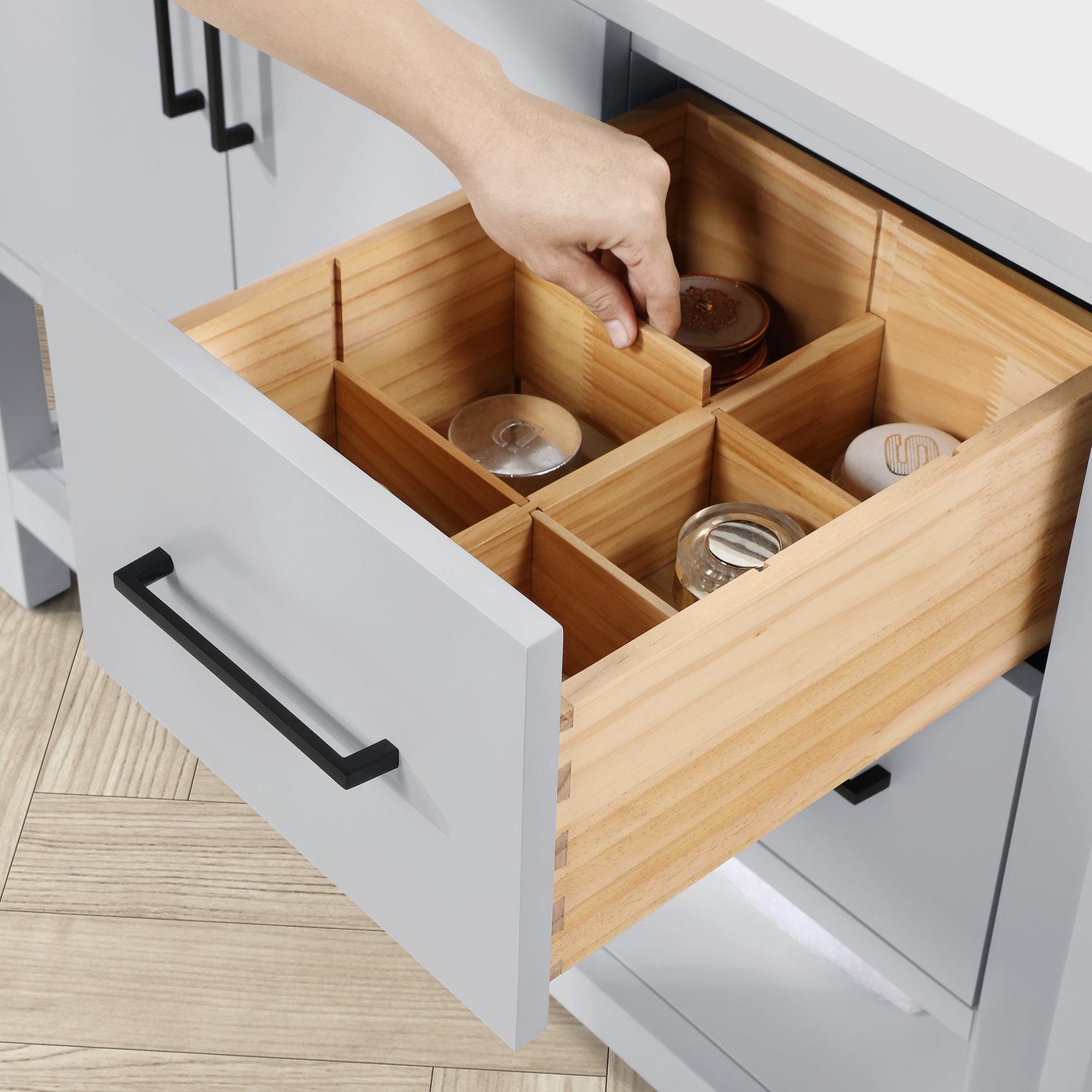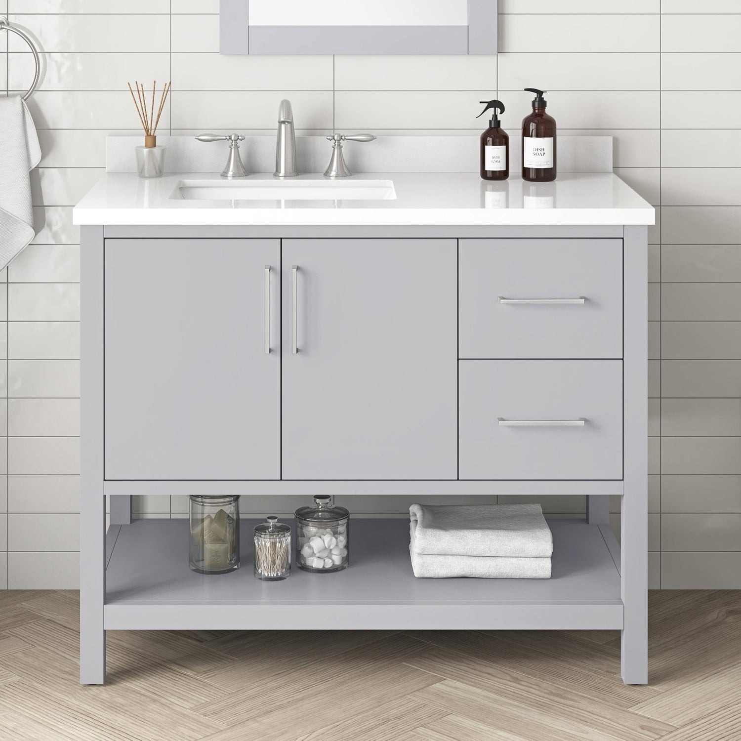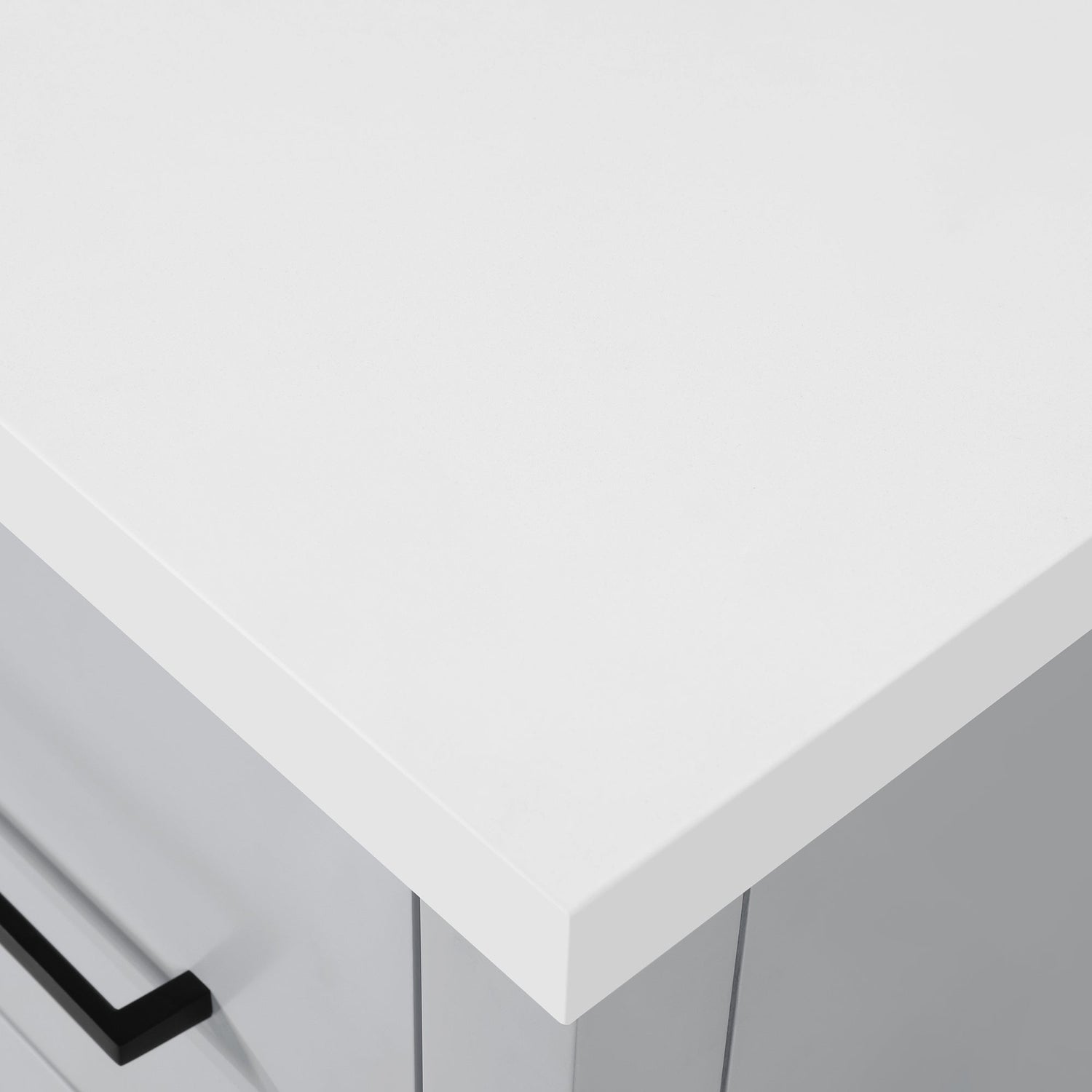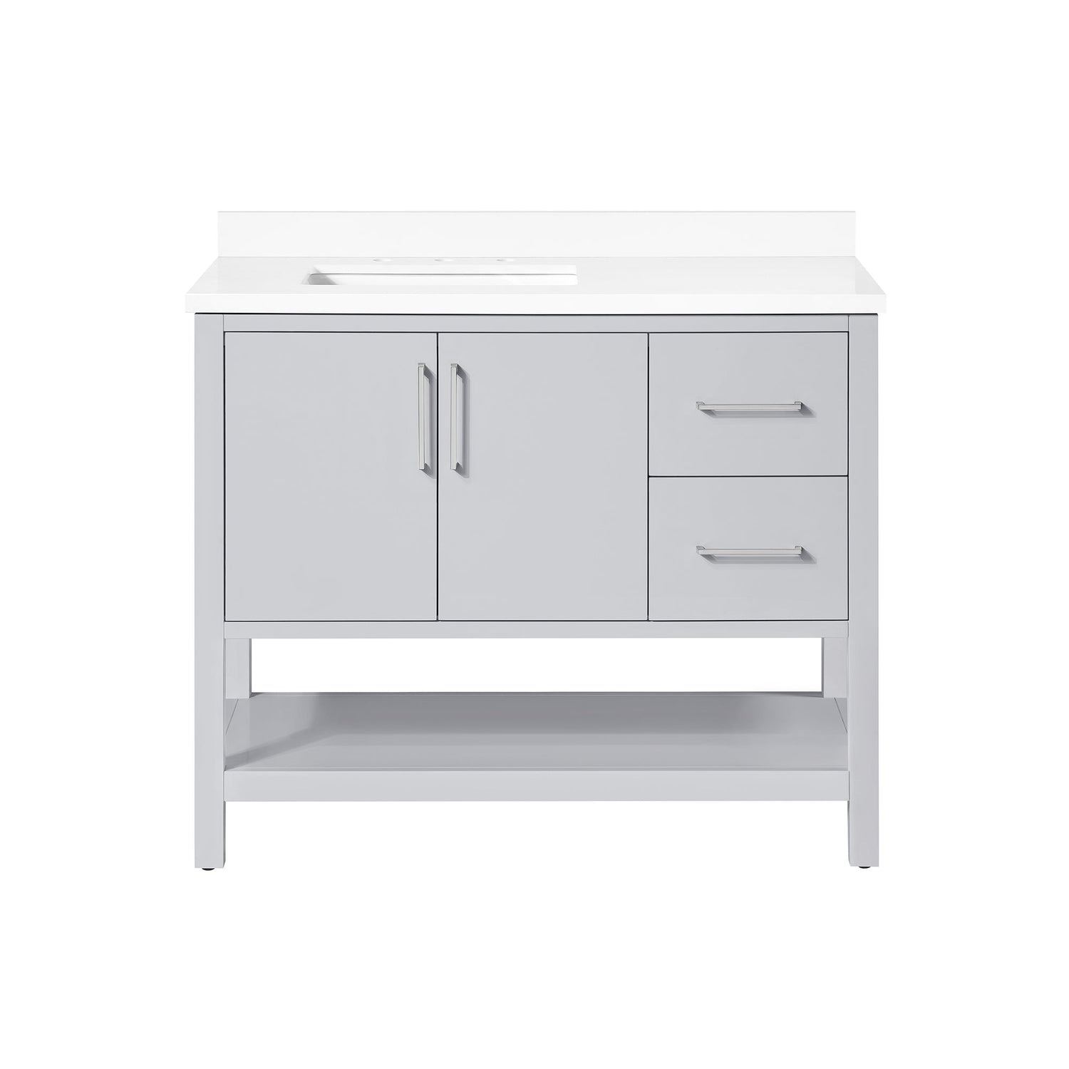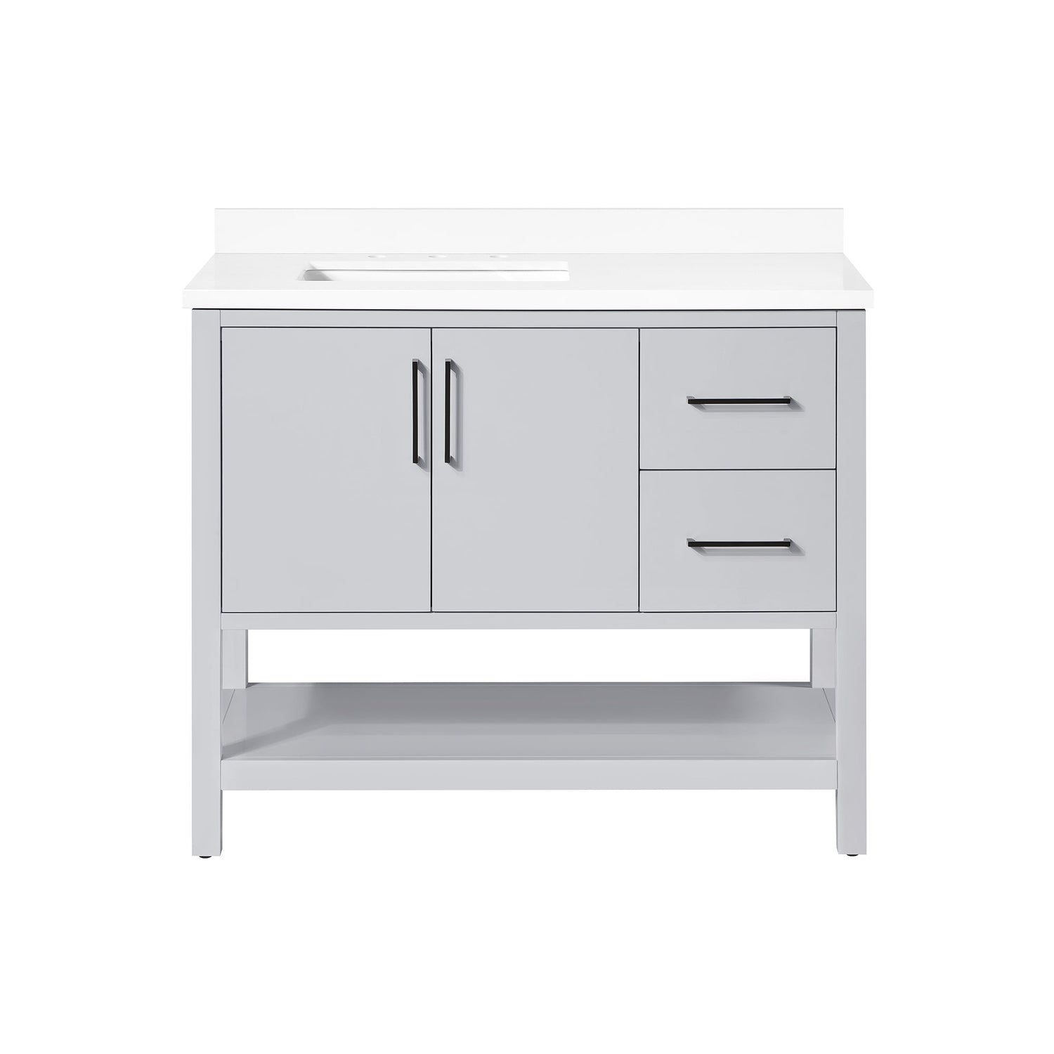 Cabinet features 2 soft-closing doors, 1 adjustable shelf& 1 open shelf. Cabinet has slab style doors and drawers . Dove Grey cabinet with with two sets of hardware in brushed nickel & matte black. White Quartz top with matching 3" backsplash & ceramic basin with pre-drilled holes for 8" faucet (faucet not included)
