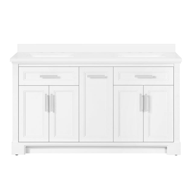 Cabinet features 5 soft-closing doors, 2 flip-down drawer, 1 adjustable shelf . Includes slide out shelf with power bar, styling tool holders and pull out drawer with wicker hamper. Integrated recessed toe kick for easy cleaning and concealing supply lines. White cabinet with two sets of hardware in brushed nickel & champagne bronze. White Quartz top with matching 3" backsplash & ceramic basin with pre-drilled holes for 8" faucet (faucet not included)