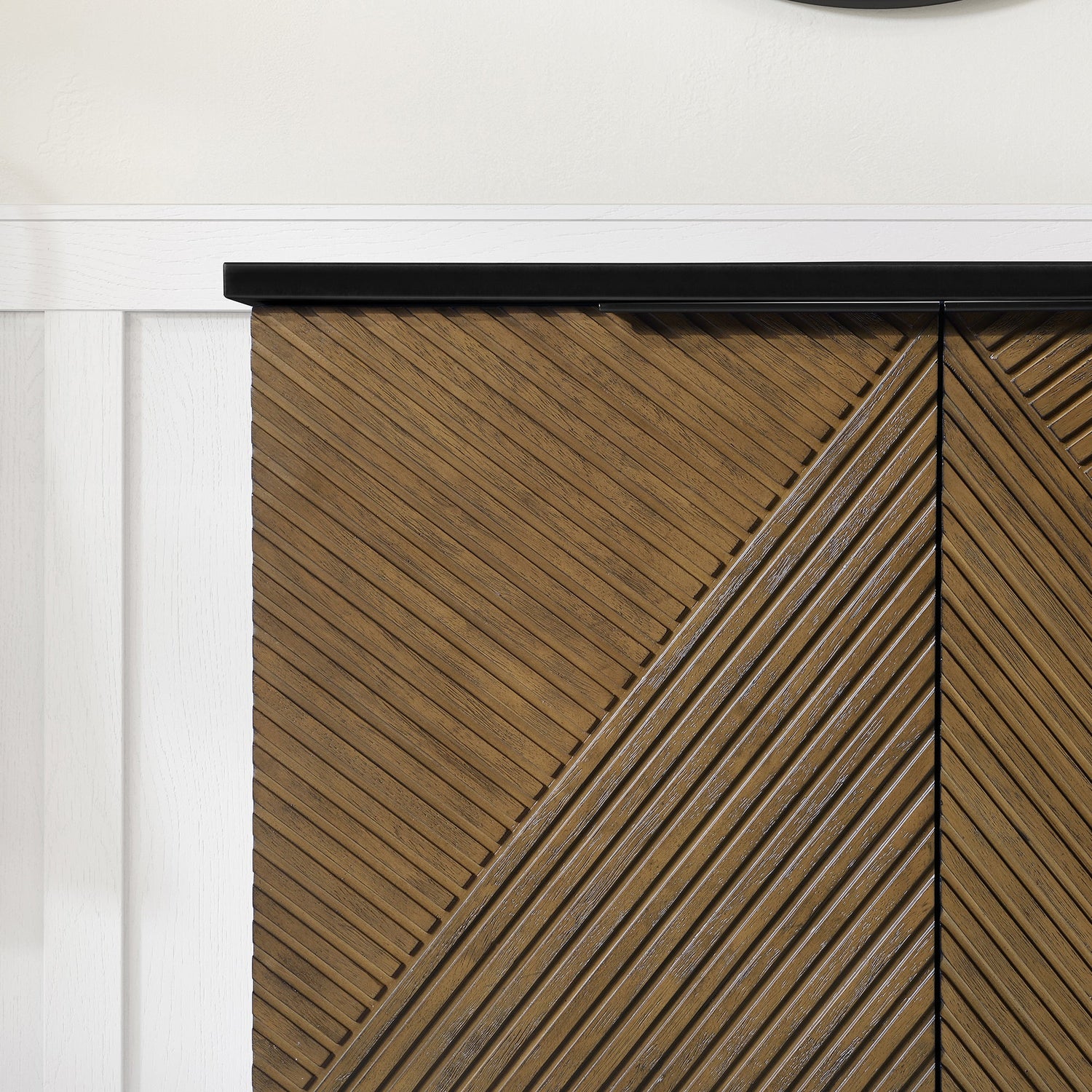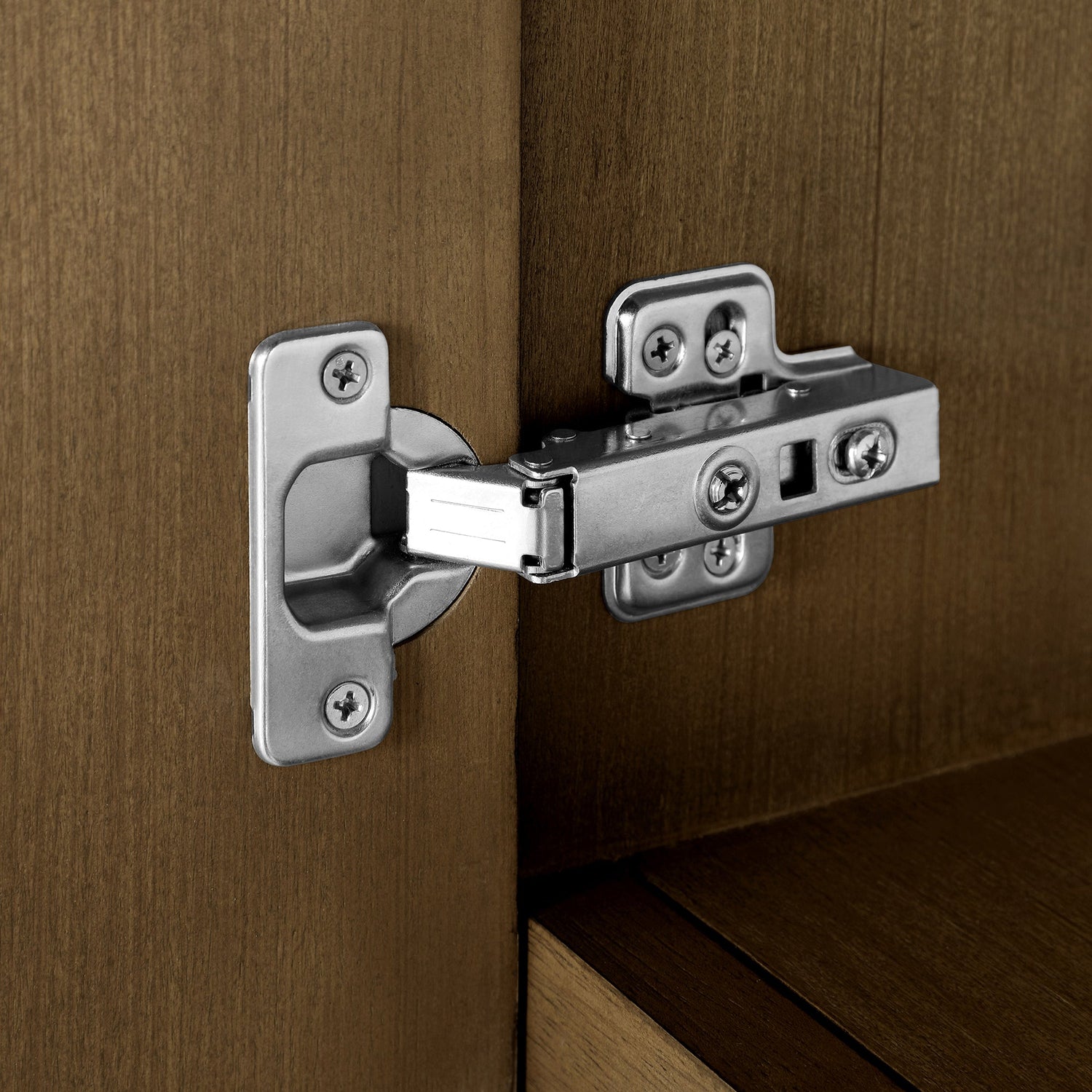 Almond Latte cabinet with with two sets of hardware in brushed nickel & matte black. Black Granite top with matching 3" backsplash & ceramic basin with pre-drilled holes for 8" faucet (faucet not included). Cabinet features 2 soft-closing doors, 1 adjustable shelf & 1 floating shelf