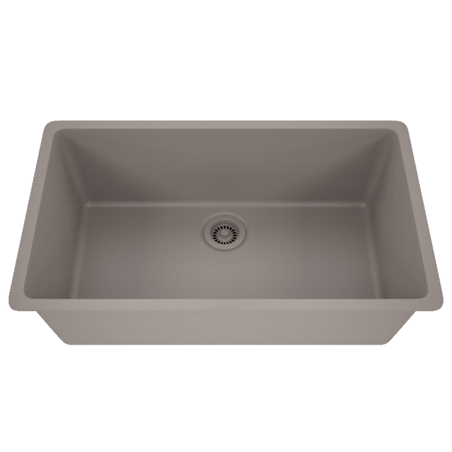 Made from 80% quartz, only diamond is harder. Durable; highly resistant to scratches and stains. Heat resistant to +500°F. Requires 3-1/2 in. drain assembly and support framing or mounting hardware (not included). Compatible with garbage disposals; does not require a flange extension
