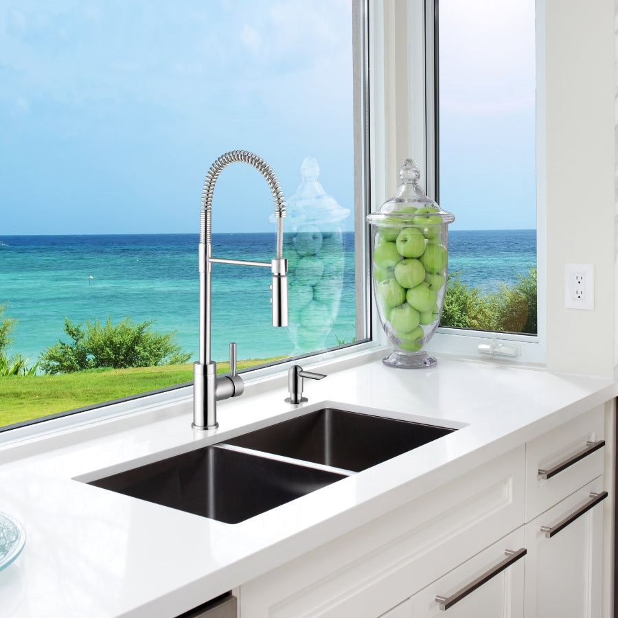 Constructed of solid brass with a polished chrome finish. Pull-down spray head features two spray modes: aerated and full. Includes soap dispenser and mounting hardware. Drip-free ceramic disc cartridge. Optional deck plate included
